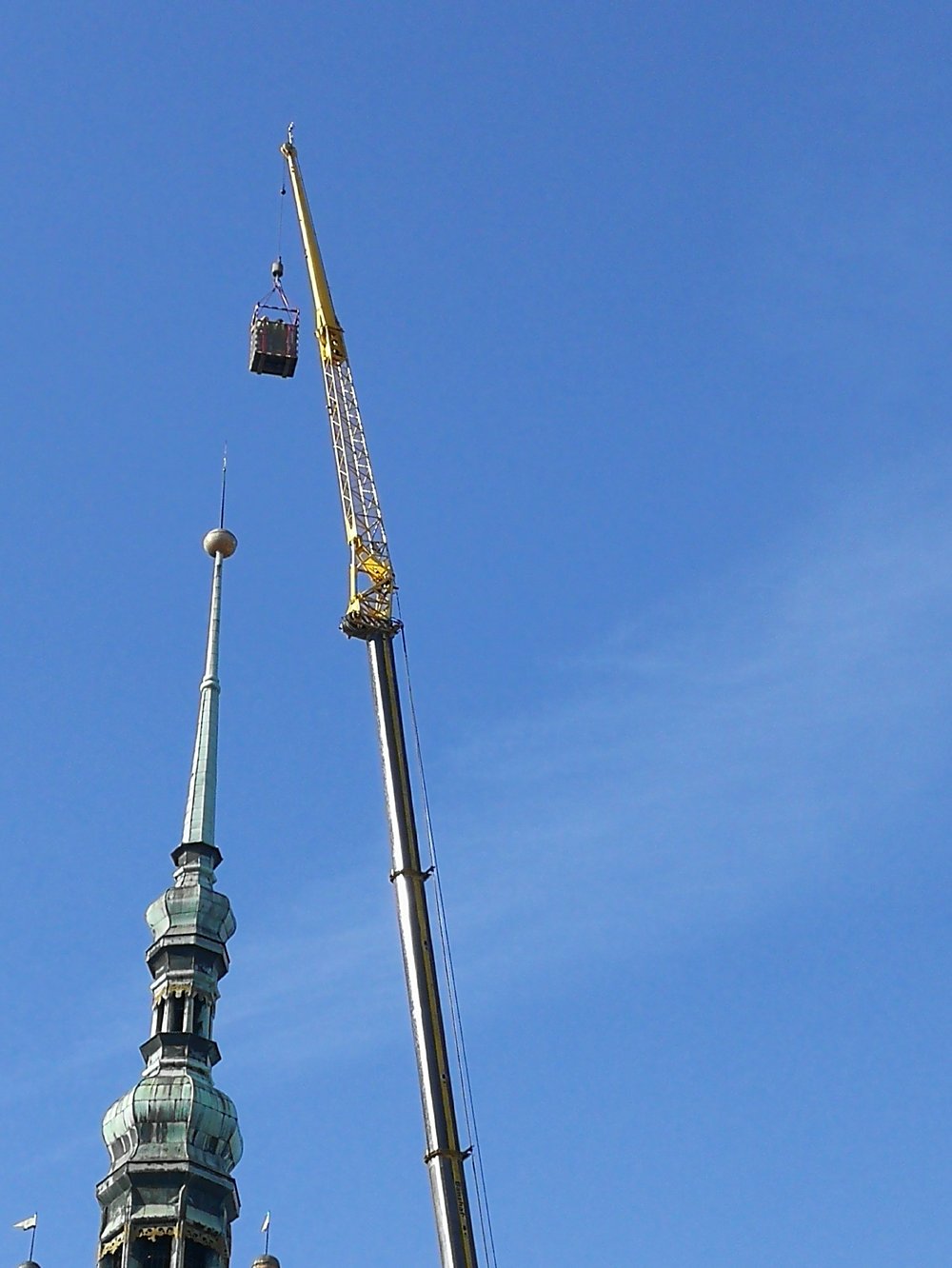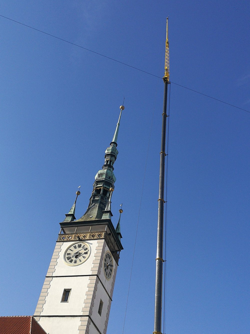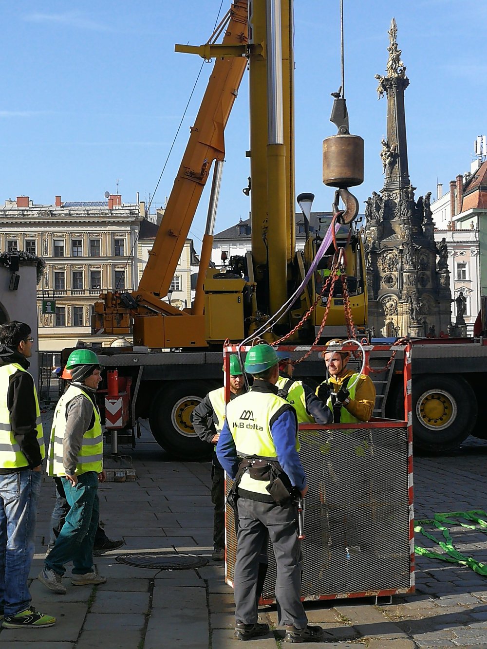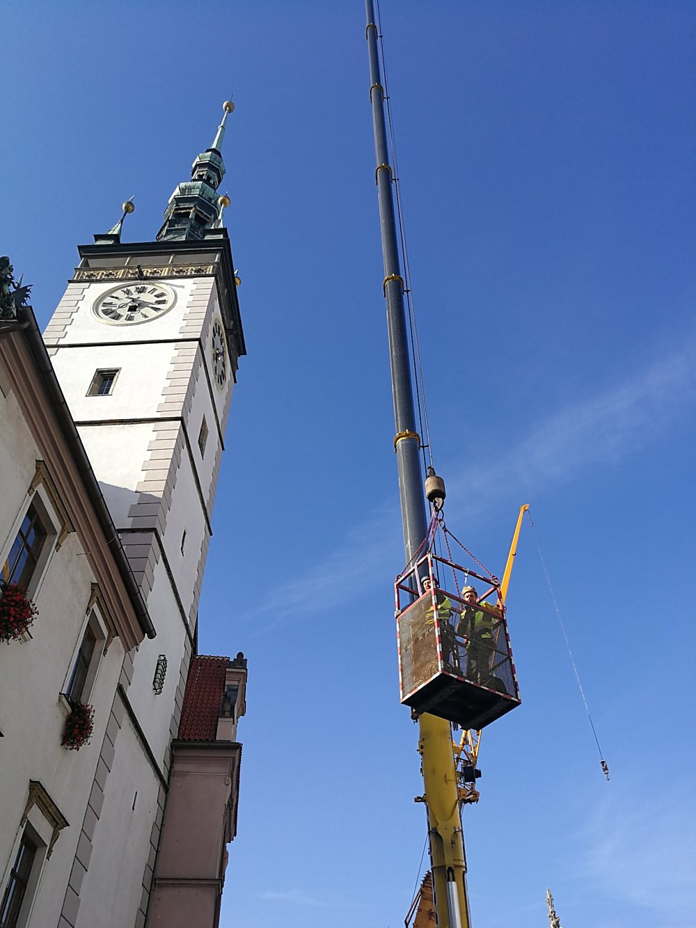 Dnes dopoledne začaly na Horním náměstí dva mobilní jeřáby s výložníky o délce cca 85 metrů demontovat nejvyšší část radniční věže (věž je vysoká 75 metrů). Jedná se o demontáž asi dvanáctimetrové špice věže. "Tato akce je technickou přípravou na chystanou rekonstrukci radniční věže. Práce budou dle stavbyvedoucího trvat nejméně dvě, ale spíše tři hodiny. Až do poslední chvíle se muselo čekat na stav povětrnostních podmínek," uvedl tiskový mluvčí magistrátu Michal Folta.