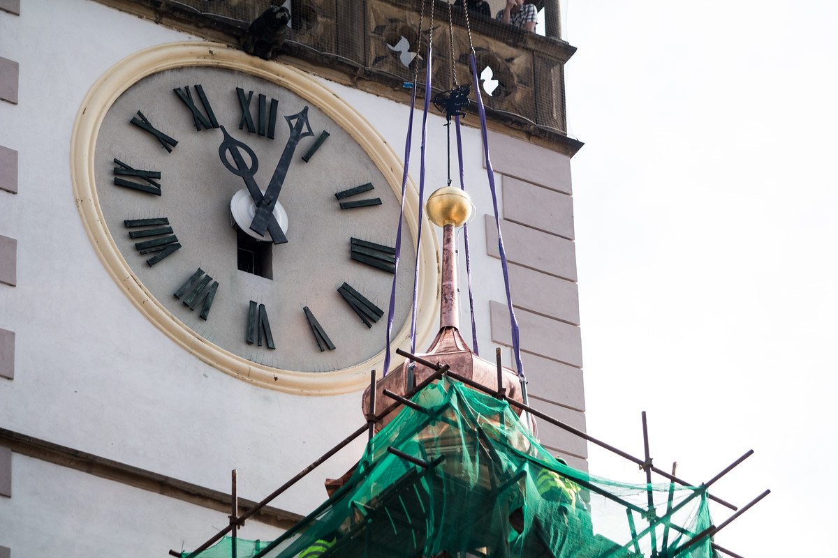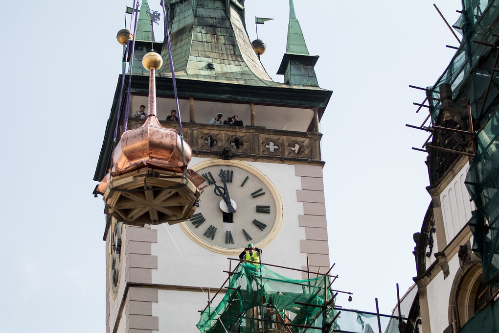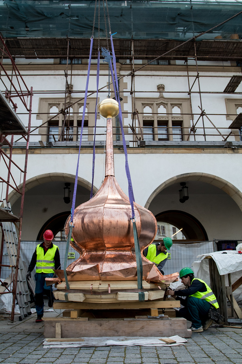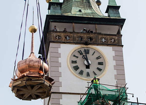 Na střechu radnice se po opravě dnes dopoledne vrátila věžička. V její makovici jsou ukryty tři tubusy, obsahující nejen historické dokumenty, ale také vzkazy dalším generacím.