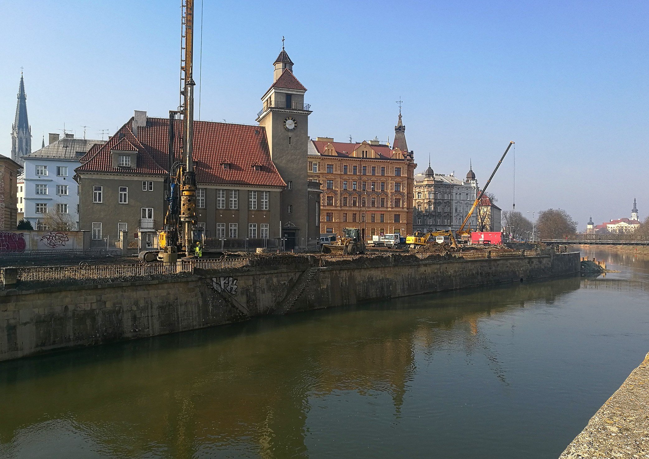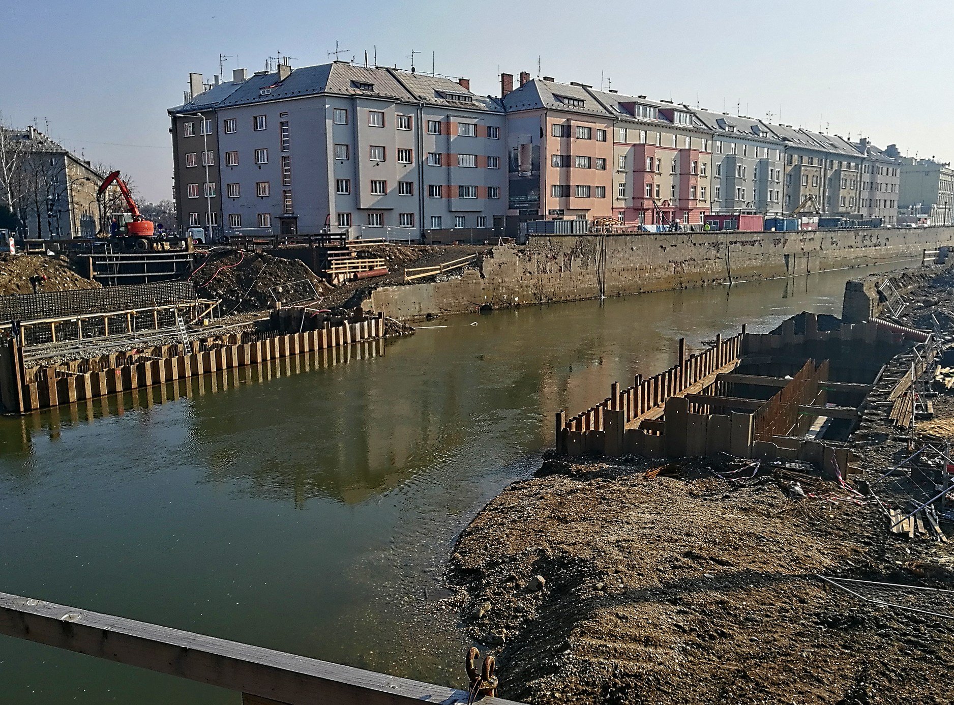 Nejintenzivnější práce probíhají na místě budoucího mostu v Komenského ulici a na obou březích řeky v úseku mezi budoucím mostem a Masarykovou ulicí. U Bristolu už jsou položeny základy pro novou mostní konstrukci, práce probíhá bez komplikací. V létě by už měla být podle vedoucího stavby Jakuba Vlka z firmy Silnice Group na konstrukci položena mostovka a poté budována komunikace. Na pravé straně nábřeží, tedy v Blahoslavově ulici, jsou aktuálně budovány piloty, na druhé straně řeky probíhá ražba kanalizačního sběrače a další práce.