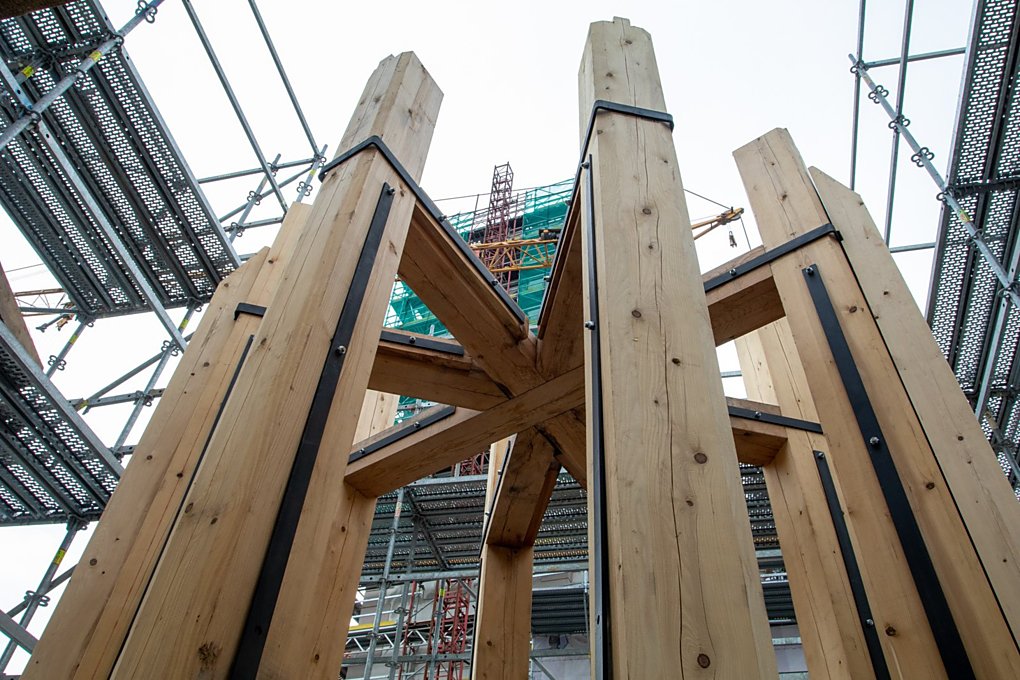 ŘÍJEN 2019. Konstrukce (zejména její spoje) staré věže byla ve špatném stavu, proto začala vznikat replika...