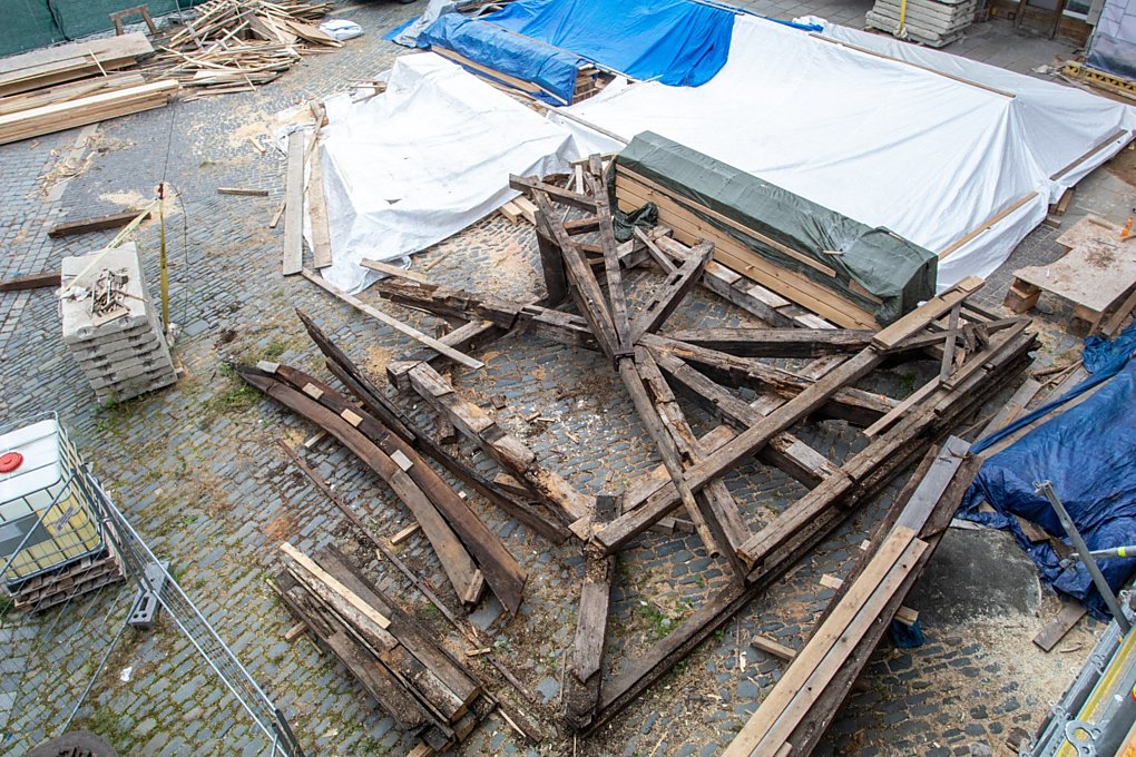 "Podle původních předpokladů jsme radniční věž měli vyzdvihávat už v srpnu. Jak se ale ukázalo, celá dřevěná konstrukce věže byla ve špatném stavu, proto bylo třeba přistoupit ke kompletní replice," sdělil Pavel Hurta, stavbyvedoucí ze společnosti H&B delta, která rekonstrukci radnice zhotovuje. Dodal také, že určité poškození původní konstrukce věže se předpokládalo, ale až důkladné prozkoumání odhalilo neutěšený stav jednotlivých spojů. "Vzhledem k těmto skutečnostem a k faktu, že by bylo nemožné se k většině spojů vůbec dostat, protože jsou v nepřístupných místech, zvolil se klasický přístup s tím, že se vytváří replika konstrukce," vysvětlil Hurta.