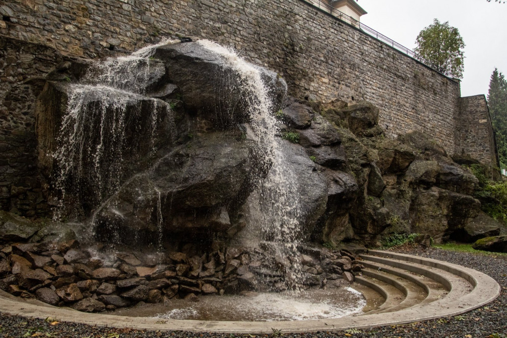 Vodopád. V Bezručových sadech byl v říjnu obnoven vodopád. Snímek pochází ze zkoušky, v provozu bude dílo až od jara.