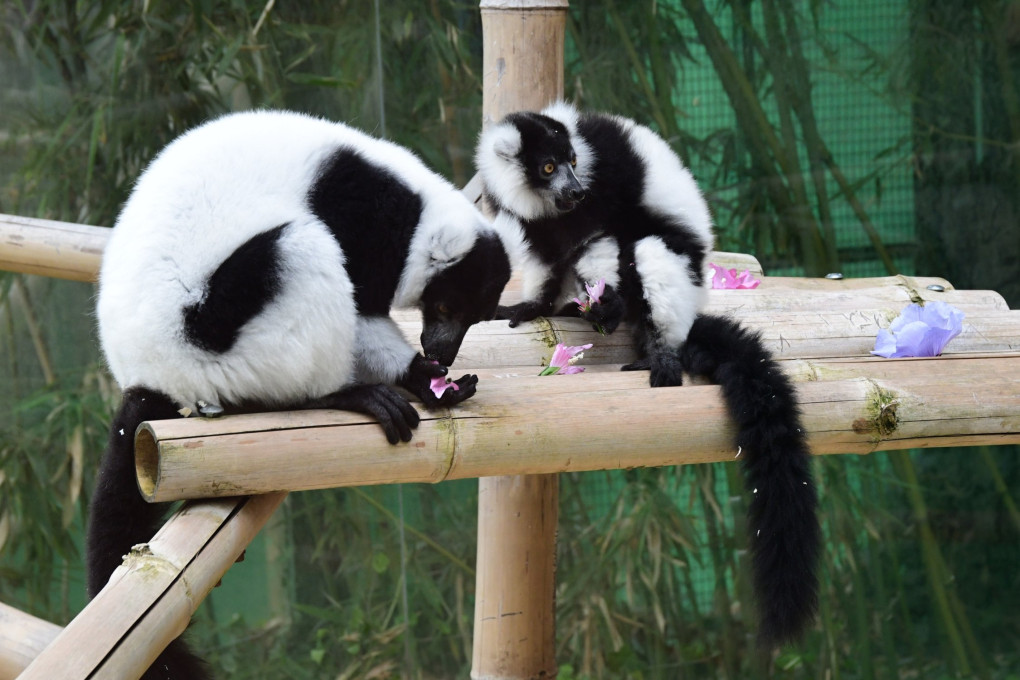 Roztomilá podívaná: lemuři a kočkodani se krmí ibiškem