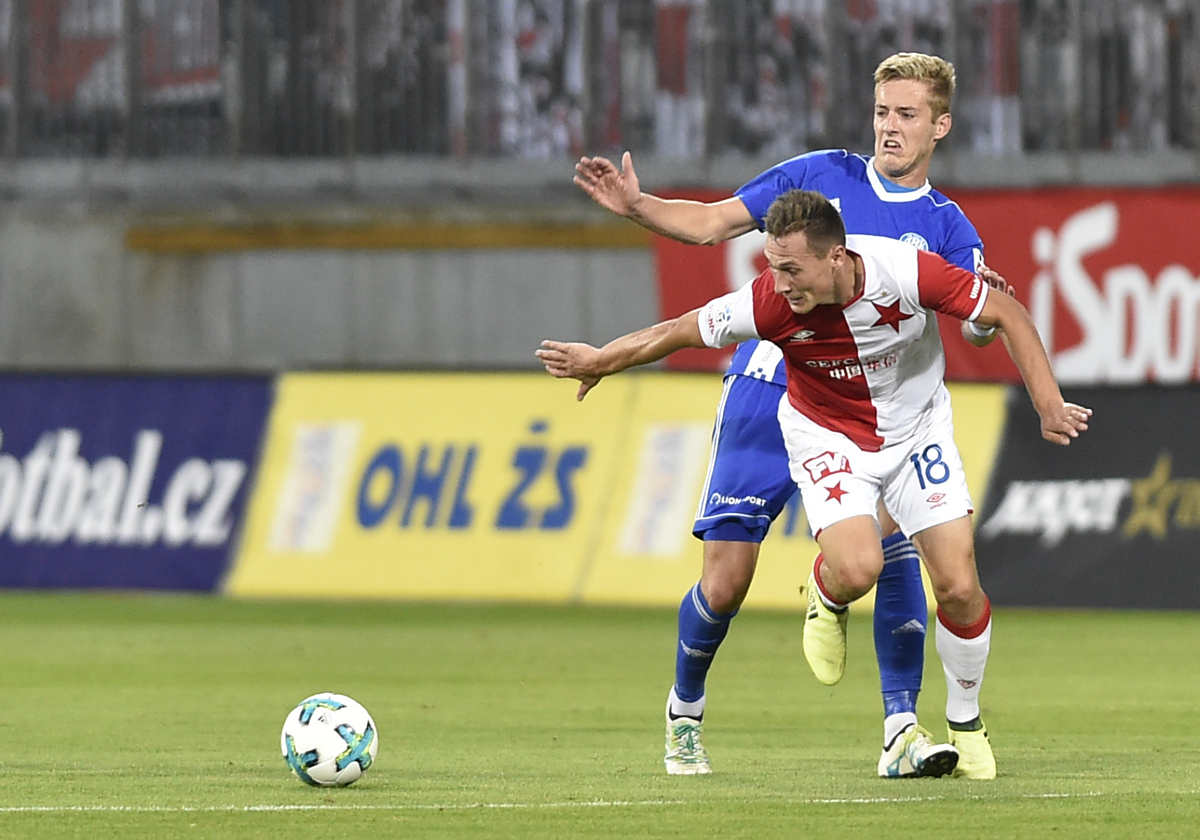 Jakub Plšek v obranné práci se Slavií Praha. Proti Dukle jej trenér Jílek pochválil také za defenzivní činnost.