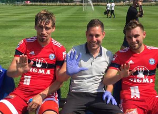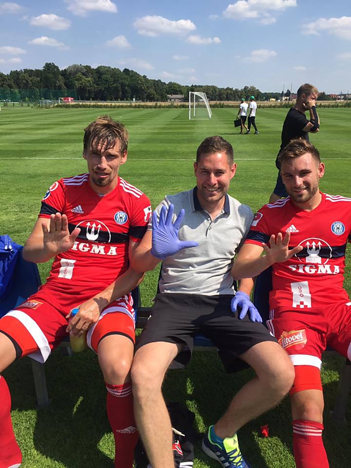 Kapitán Sigmy Aleš Škerle, lékař týmu Jiří Lošťák a záložník či útočník Lukáš Buchvaldek ukazují počet gólů, kteří Hanáci nasázeli izraelskému soupeři.