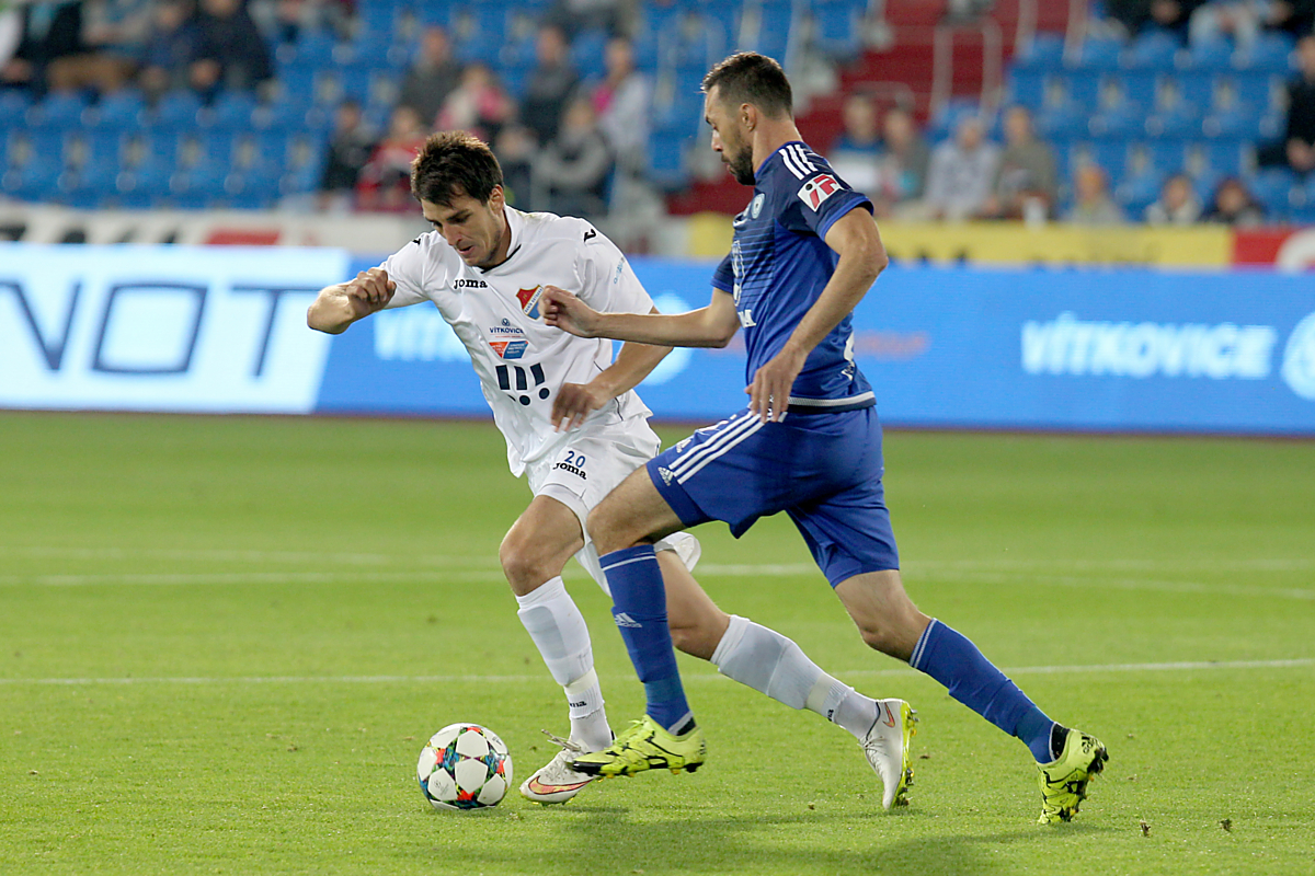 Střelec první branky Baníku Ostrava Jaroslav Machovec v souboji s Michalem Ordošem.