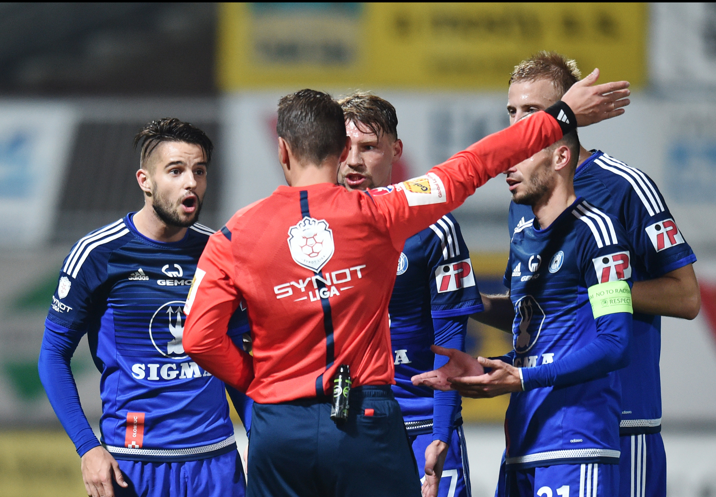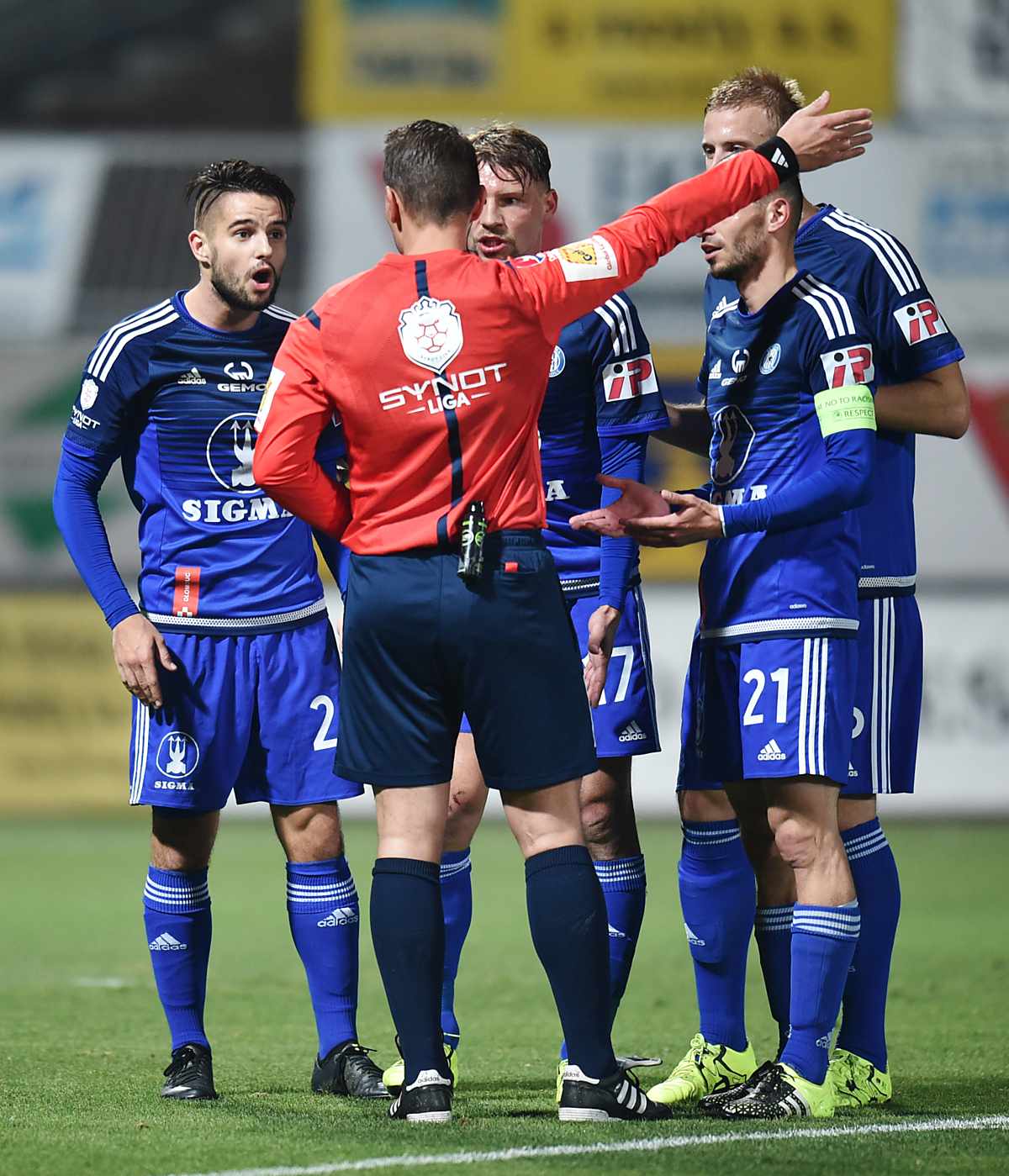 Za co? Hráči Sigmy protestují u sudího Hrubeše proti vyloučení Martina Hály. Zpomalený záběr prokázal, že olomoucký obránce se Mingazova nedotknul.