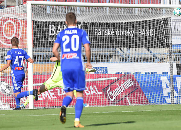 Jiří Texl dává svoji druhou branku v utkání se Zbrojovkou Brno. Úvodní čtvrthodina byla ze strany Sigmy snová...