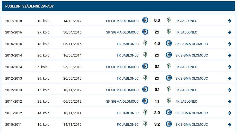 Sigma Olomouc prohrála v Jablonci už devětkrát v řadě, naposledy vyhrála na tomto hřišti 14. srpna 2005 2:1, góly dali Brazilci Melinho s Gauchem. Za Sigmu tehdy hráli i současní trenéři Onofrej s Lovásikem, za Jablonec chytal současný kouč brankářů Michal Špit.
