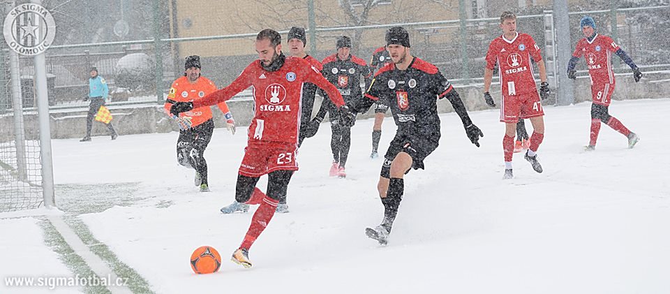 Trenér Sigmy Václav Jílek avizoval, že postaví do utkání dvě jedenáctky. Rovnoměrně rozložil zkušenosti i mládí a fungovalo to i na sněhu a za vydatného chumelení. Z herní převahy v prvním poločase byly dvě branky. Hanáky poslal do vedení ve 14. minutě Jakub Plšek, ve 29. pak zvýšil Jakub Řezníček. Ale v první půlce nebylo pro domácí jen veselo, ve 21. minutě musel pro zranění vystřídat Michal Vepřek.