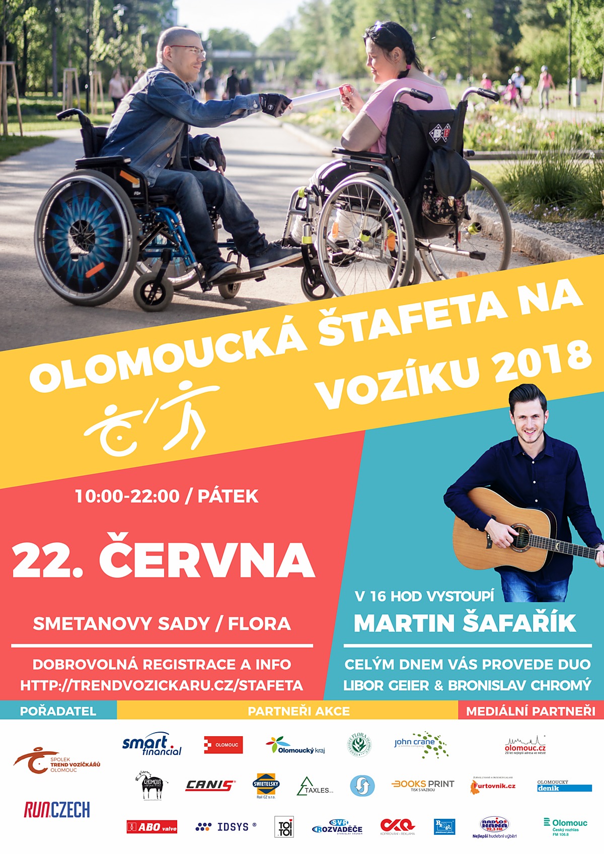 Spolek Trend vozíčkářů Olomouc pořádá již 6. ročník Olomoucké štafety na vozíku, která je součástí doprovodného programu Mattoni 1/2Maratonu Olomouc 2018. Štafeta proběhne ve Smetanových sadech u restaurace Fontána jako dvanáctihodinová akce a bude zahájena v pátek 22. června v 10:00. Smyslem této akce je propojení široké veřejnosti se světem lidí užívajících vozík k běžnému pohybu formou zábavné štafety absolvované na invalidním vozíku.