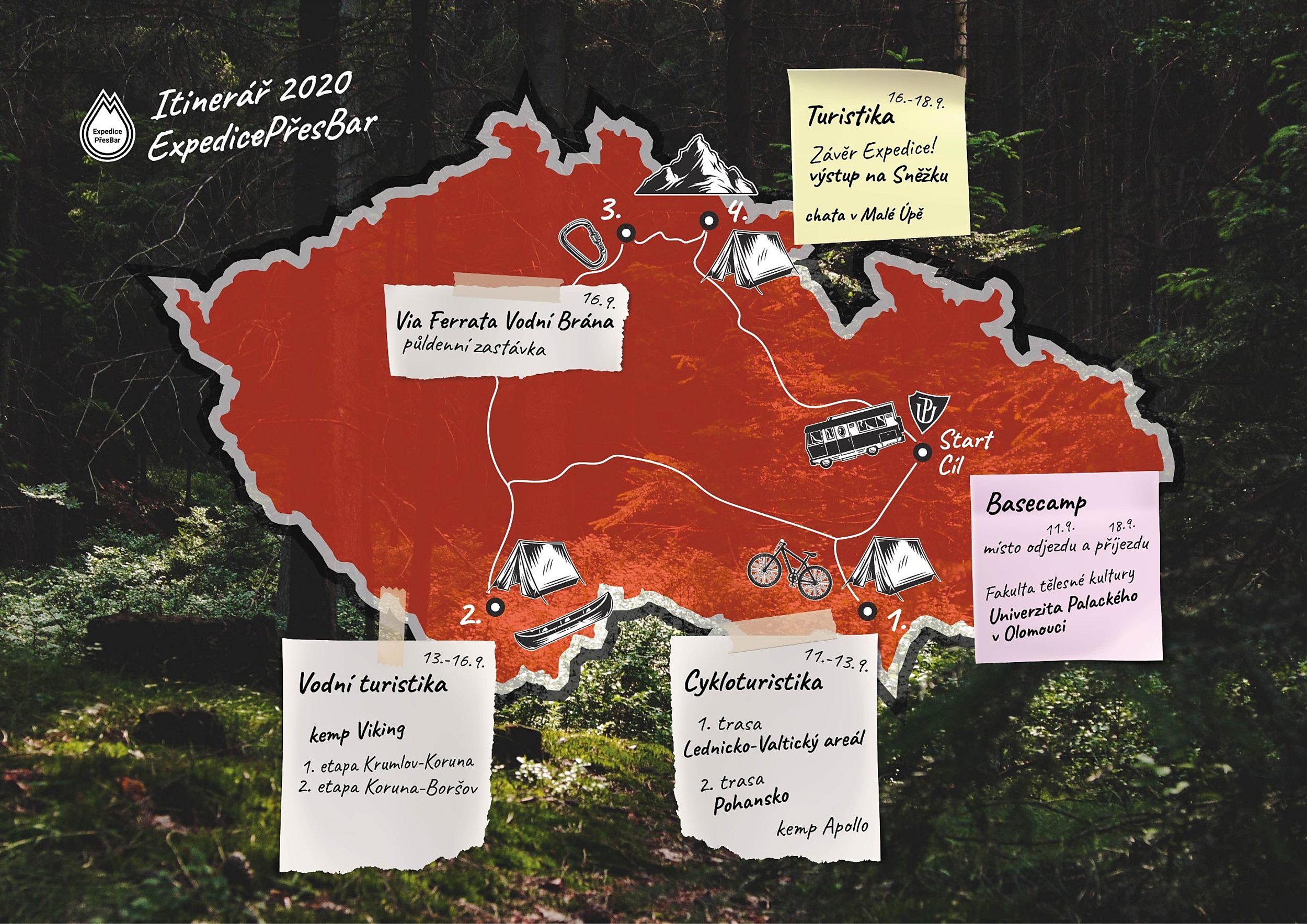 Podobně mluví i garant expedičního kurzu Ondřej Ješina z katedry aplikovaných pohybových aktivit: "Letošní ročník je kvůli epidemiologické situaci odlišný než v předešlých letech. Jarní termín nahrazujeme podzimním a alpské destinace těmi českými. Přesto věřím, že improvizované prostředí a termín nezhatí naše plány a snahu o dosažení všech cílů naší expedice." Na přípravách cesty, která potrvá od 11. do 18. září, se podílí pětadvacet studentů studijních oborů Aplikované pohybové aktivity a Aplikovaná tělesná výchova. Včetně vyučujících a doprovodu některých hostů bude výprava čítat padesát lidí. Týdenní putování vyjde zhruba na dvě stě tisíc korun. Většinu nákladů pokryje účastnický poplatek, část peněz studenti získali také prostřednictvím crowdfundingové sbírky.