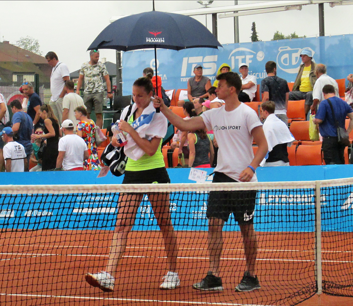 Kristýna Plíšková při odchodu do zázemí turnaje při dešti, který duel přerušil na hodinu a půl.