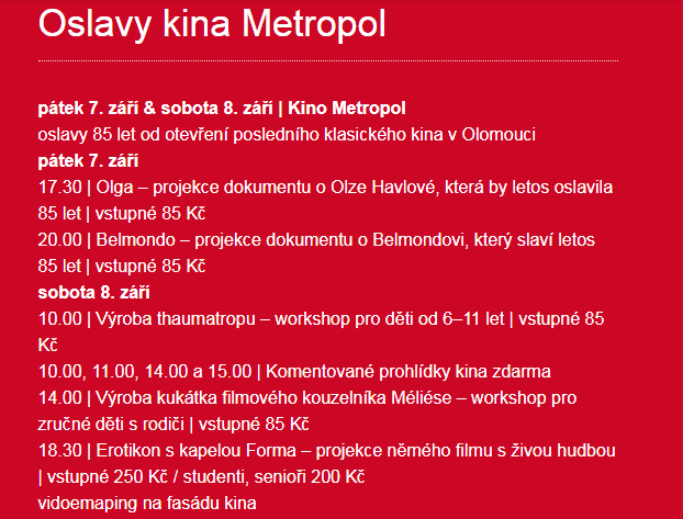 V rámci Dnů Evropského dědictví máte v sobotu také jedinečnou možnost vypravit se na komentovanou prohlídku kina Metropol a podívat se tak na místa, kam běžný divák nemá přístup. Prohlídky jsou omezeny počtem diváků a začínají v 10:00, 11:00, 14:00 a 15:00. Vstup je zdarma. Stejnou možnost nabízí i Divadlo Tramtarie, kam můžete na komentovanou prohlídku divadla i zákulisí vyrazit v 15:00, 16:00 a 17:00. Prostorem vás provede herec Miroslav Černý.