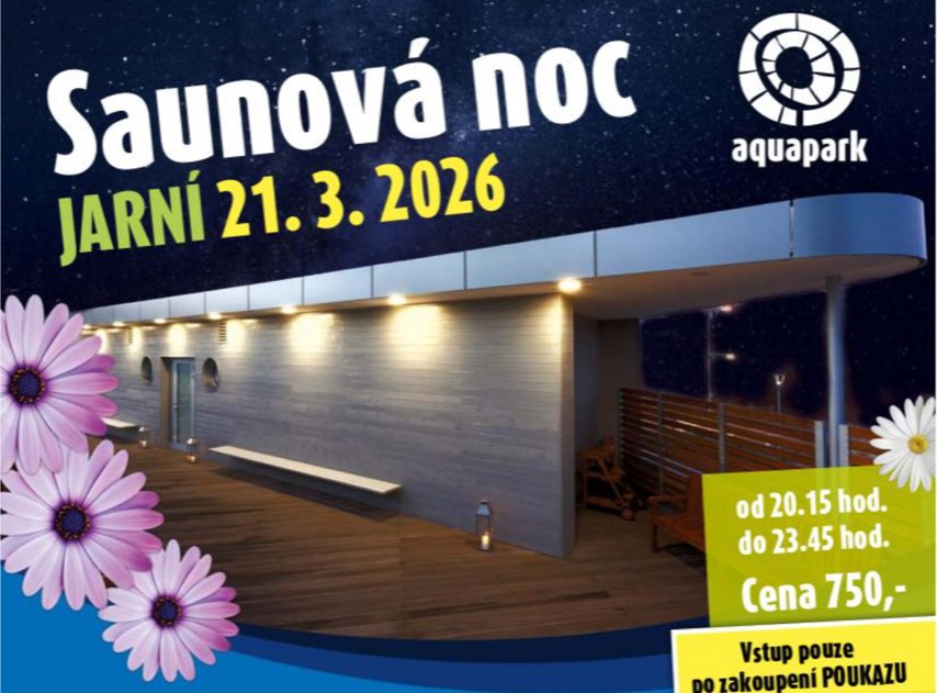 Aquapark Olomouc zve v sobotu večer na saunovou noc. Od 20:15 můžete vstoupit na 3,5 hodiny do wellness zóny, užít si tematicky laděné ceremoniály, peelingové procedury a ochutnávku masáží.