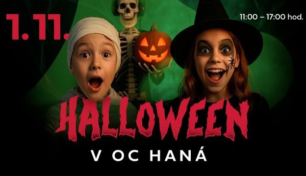 Přijďte oslavit Halloween do OC HANÁ! Od 11 do 17 hodin vás čeká den plný aktivit, soutěží a zábavy. Zapojte se do soutěže o nejvýstřednější kostým, užijte si strašidelné disko hry i tematické aktivity na několika stanovištích. Vstup je zdarma a více podrobností se dozvíte zde →
