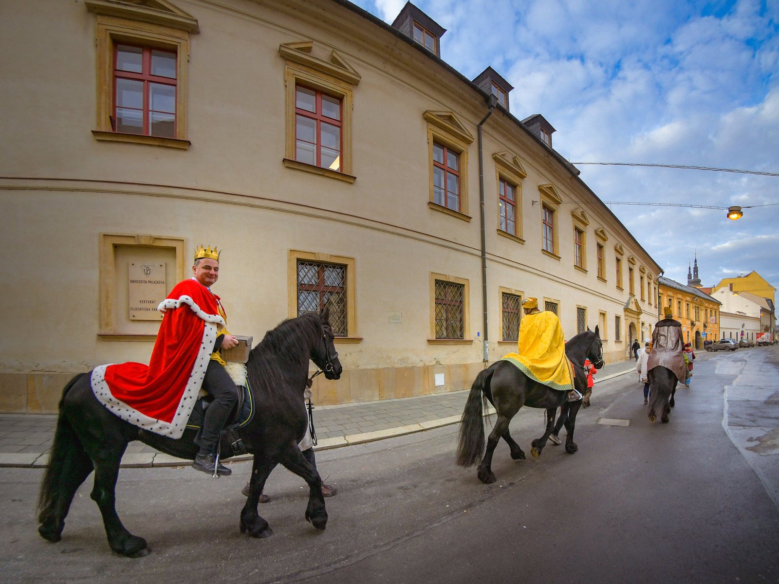 Na začátku svého putování po Olomouci se tři králové pokloní narozenému králi v jeslích v katedrále svatého Václava. Poté vyrazí tříkrálový průvod v čele s hejtmanem, primátorem a biskupem v doprovodu zpěváků na Horní náměstí k radnici, kde proběhne společný program tří králů a sboru opery a operety Moravského divadla Olomouc pod vedením Lubomíry Hellové.