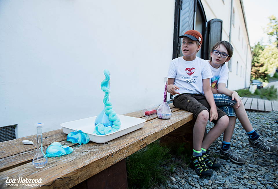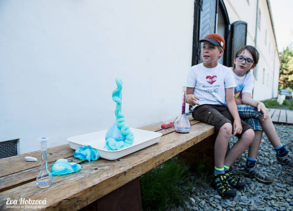Oblíbenou aktivitou je návštěva laboratoře, kde se děti proměňují v opravdové vědce. Do rukou si vezmou třeba pipety, zkumavky a zkoušejí jednoduché pokusy se surovinami, které mohou najít také doma v kuchyni. "Na našem stanovišti vyrábíme sopky a ukazujeme si známou reakci, kdy smícháme ocet, jedlou sodu a barvivo. Venku před budovou se potom pouštíme do profesionálnějších a větších pokusů a hrajeme si s plyny," řekl animátor Tomáš Heger, který studuje biochemii na Přírodovědecké fakultě UP. Táborníci také kreslí do mléka nebo pomocí cukru, vody a barviva vyrábějí cukrovou duhu a zjišťují, že kapaliny s různou hustotou se nemíchají, ale vytvářejí barevné vrstvy. Některé pokusy si mohou vyzkoušet doma. "Tady je voda a barvivo. Nahoře je pak olej a nějaká šumivá tableta, ve které je kyselina citronová a jedlá soda. Když ji do kelímku hodíme, udělá to takovou krásnou fontánku," popisuje jeden z pokusů devítiletá Nikola Zbořilová z Olomouce. Na vědeckém táboře v Pevnosti poznání je již potřetí. "Je to zajímavé. Bavila mě také biologie, kdy jsme na základě indicií zjišťovali, jaké jsme zvíře. My jsme byly vážky," vyprávěla dívka. Děti na táboře poznávají nejrůznější živočichy a jejich pozoruhodné vlastnosti, které jim umožňují přežít každodenní nástrahy nepředvídatelného života, jehož nedílnou součástí je i člověk. Skupiny mají před sebou dvanáct úkolů, které je provedou od počátku vzniku Země, přes tvorbu jednoduchých buněk s genetickou informací až po vznik mnohobuněčných organismů a jejich charakteristických vlastností.