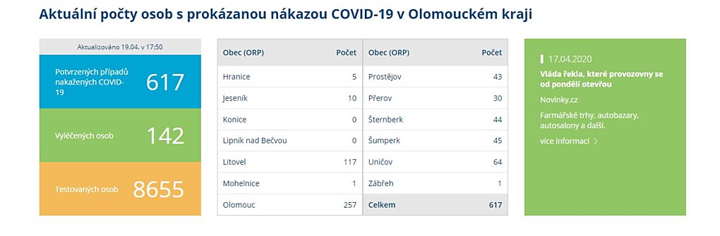 Od začátku vypuknutí epidemie eviduje krajská hygiena v Olomouckém kraji 617 nakažených lidí. Celkem se již uzdravilo 142 osob, u nichž byl nový typ koronaviru diagnostikován. Dnes se začala uvolňovat některá vládní opatření.