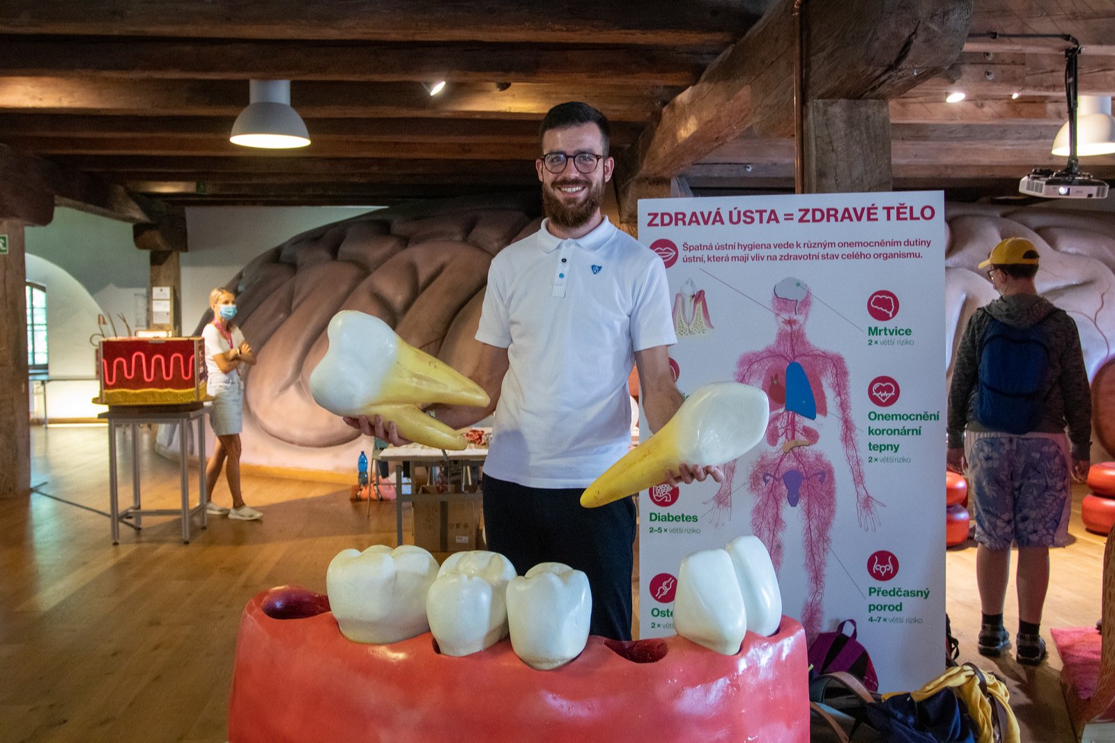 Nový je i exponát části dásní s vyjímatelnými zuby. “Jsou tu všechny zuby od jedničky po sedmičku. Když si jednotlivé zuby vyjmete, krásně vidíte jejich strukturu. Do budoucna bychom rádi odlili ještě další zuby, na nichž by se dal ukázat zubní kaz, můstky a další záležitosti,” řekl Chvátal. Výhodou celé expozice podle něj je právě to, že se dá rozvíjet.