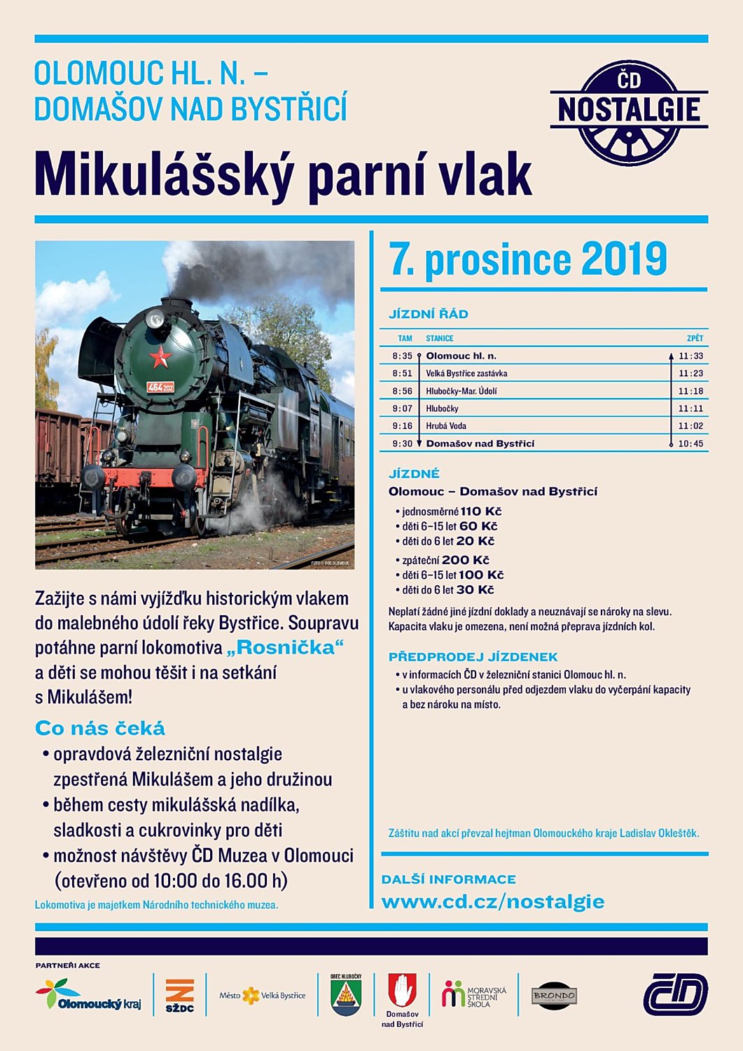 V sobotu 7. prosince vyrazí z hlavního nádraží do Domašova nad Bystřicí zvláštní Mikulášský parní vlak. Hodné děti se mohou těšit na sladkou nadílku, ty zlobivé si vezme do parády čert. V čele soupravy pojede parní lokomotiva 464.202 Rosnička. Své brány otevře v sobotu také ČD Muzeum v Olomouci.