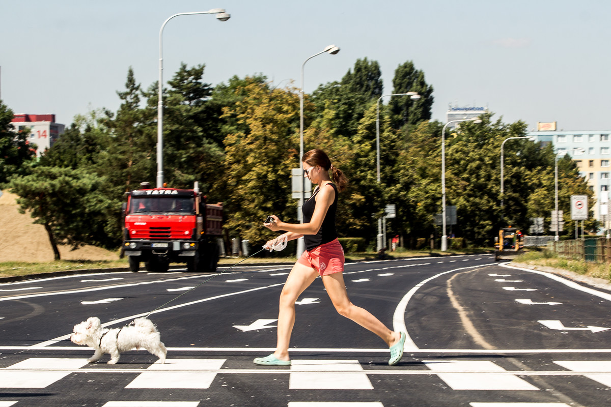 Zatím je Velkomoravská rájem pro pěší a cyklisty. Takový klid jako dnes v poledne tu není ani v noci.