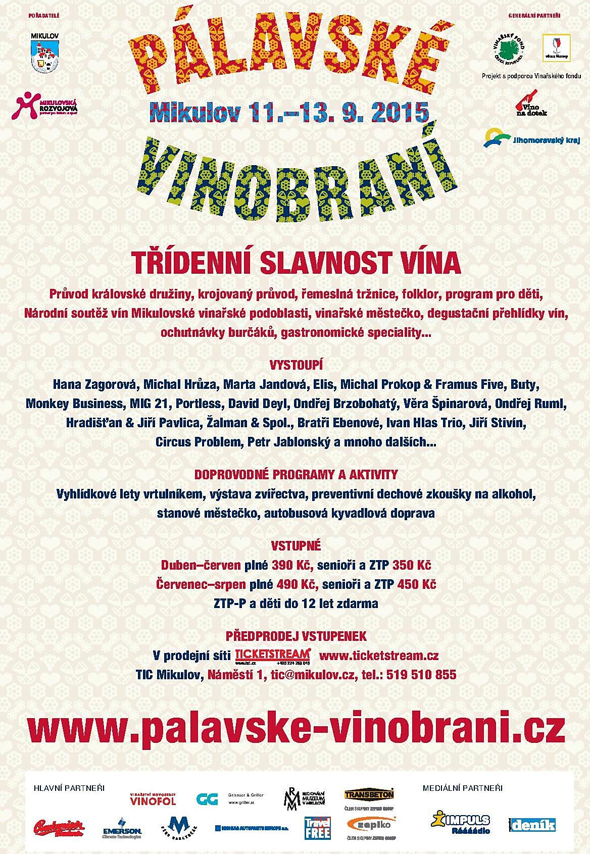 Mikulov stejný víkend láká na Pálavské vinobraní, které nabídne například pochodňovou show, průvod královské družiny, spoustu krojů, řemeslnou tržnici, národopisné soubory i cimbálovou a dechovou muziku. Součástí programu jsou koncerty hvězd české i slovenské hudební scény, stánky s vínem, burčákem a gastronomickými specialitami nebo nedělní výstup na Svatý kopeček. Po celou dobu vinobraní bude v hlavním sále zámku probíhat prestižní veřejná výstava Národní soutěže vín, kde budete moci ochutnat více než 500 vzorků bílých, růžových a červených vín z Mikulovské vinařské podoblasti. Víno je charakteristické nejen svou chutí, ale mnoha vůněmi. A jelikož k plnohodnotnému prožitku poznávání vína čichem patří, bude v Gajdošově sále zámku probíhat zábavně – vzdělávací akce Mistrovství České republiky v rozeznávání vůní ve víně. Prohlídky a řízené degustace čekají i v dalších prostorách zámku a několika místních vinařstvích nebo v Kapucínské ulici, kde vyroste vinařské městečko se stánky jednotlivých výrobců vína. Samozřejmě i Pálavské vinobraní nabízí bohatý doprovodný program, v pátek zde vystoupí například Ondřej Brzobohatý, Ivan Hlas nebo Mig 21, v sobotu přijede na náměstí královský průvod Václava IV. s královnou Chantal Poullain, za bohaté účasti krojovaných souborů, dále se můžete těšit na imitátora Petra Jablonského, Hradišťan s Jiřím Pavlicou, Jiřího Stivína či Věru Špinarovou. Odpoledne v amfiteátru bude ve znamení dalších hudebních hvězd, které slovem provede Jakub Kohák. Vystoupí zde například Hana Zagorová, David Deyl s kapelou, Michal Hrůza nebo Marta Jandová, kapela Buty a Monkey Business. Při nedělním výstupu na Svatý kopeček budou hrát Žalman & spol. a bratři Ebenové.