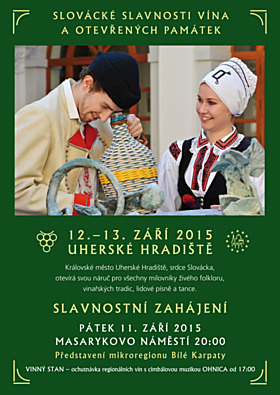 Slovácké slavnosti vína a otevřených památek jsou jedinečnou akcí, kde se po dva zářijové dny, opět 12. a 13. září, snoubí temperament lidových tradic a kultury, pestrost slováckých krojů a muziky s živelností a spontánní atmosférou. Královské město Uherské Hradiště nabízí neopakovatelný zážitek a ochutnávku živého folkloru v duchu vinařských tradic, lidové písně a tance. Slavnosti nejsou jen "obyčejným" folklorním festivalem, ale skutečnou reprezentativní národopisnou slavností více než šedesáti měst a obcí z celého regionu Slovácka. Na rozdíl od dvou zmíněných vinobraní nestaví svůj program na slavných hudebních skupinách ani historii, ale na místním folkloru. Centrum města se každoročně promění v jedno velké pódium, na němž se představují desítky folklorních souborů, cimbálových muzik i dechových kapel, a společně s ochutnávkou vín, burčáku a regionálních gurmánských specialit vytvářejí nezapomenutelný zážitek pro desetitisíce návštěvníků. Po celou dobu jsou otevřeny nejvýznamnější památky města či jinak významné objekty, k nim se odpoledne přidá také Vinohradská ulice, plná malých sklípků, kde každý, kdo půjde kolem, může ochutnat víno i burčák od místních vinařů, chléb se sádlem, škvarky či jiné delikatesy. Celá akce je zdarma, zaplatíte tedy jen to, co sníte či vypijete.