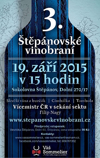 O týden později, v sobotu 19. září, proběhne vinobraní o pár kilometrů blíž. Za vínem tak nemusíte jezdit až na jižní Moravu, ale stačí, když se projedete do Štěpánova. Třetí štěpánovské vinobraní vypukne od tří tří hodin v místní sokolovně. Budete zde moci ochutnat několik desítek skvělých vín z dílny šikovných moravských vinařů a samozřejmě i pravý burčák. Velkým lákadlem třetího ročníku Štěpánovského vinobraní bude exhibiční show vicemistra ČR v sekání sektu Filipa Nagyho, který předvede návštěvníkům neuvěřitelné kousky. Nebo soutěž v natahování vína koštýřem. K poslechu bude hrát cimbálová hudba ze Svatobořic-Mistřína. Organizátoři navíc připravili speciální akci, kde hlavní roli hrají pánské motýlky. Kdo přijde s touto ozdobou na krku, dostane vstupné pro svoji drahou polovičku zdarma, sám se pak může vyfotit spolu s ostatními omotýlkovanými pány.