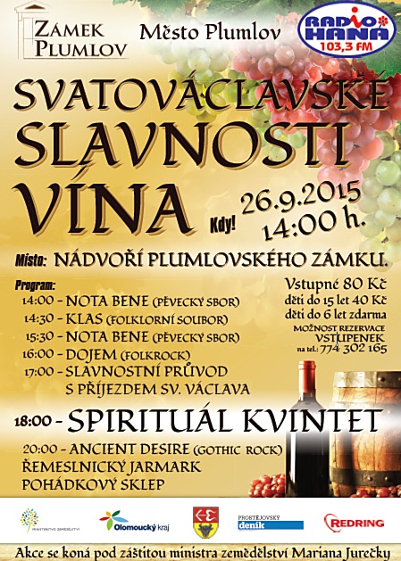 V sobotu 26. září vina můžete vyrazit na Svatováclavské slavnosti vína, které budou probíhat v nádvoří plumlovského zámku, a to už od 14:00, kdy odstartuje také kulturní program. Vrcholem odpoledne pak bude průvod v čele se svatým Václavem, který přijede v 17:00. O hodinu později vystoupí na nádvoří Spiritual Kvintet. Vstupné na akci je 80 korun, děti zaplatí polovic. Po celou dobu bude pro návštěvníky kromě vína a burčáku připraven také řemeslný jarmark nebo pohádkový sklep.