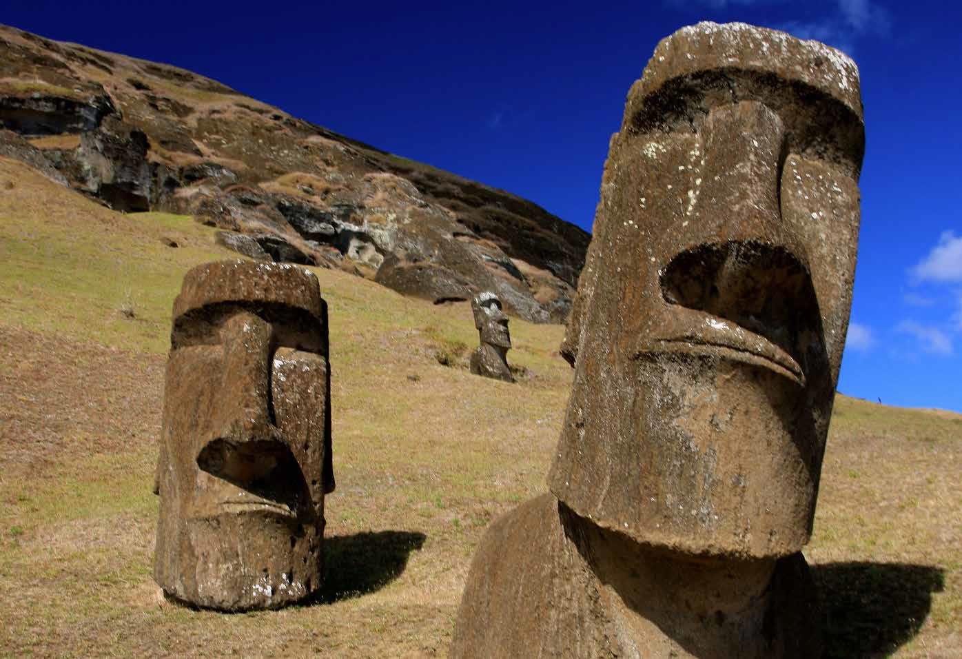 Po celém Velikonočním ostrově je rozptýleno 887 obřích soch, vztyčeno jich bylo ale asi jen 300. Většina jich nestojí volně, ale na kamenných plošinách ahu. Ty jsou rozmístěny podél pobřeží a sochy se tak dívají směrem k moři. Největší socha měří úctyhodných 21 metrů a váží 270 tun, zůstala ovšem nedokončená. Až ve 20. století se přišlo na to, že velká část sochy je vždy zasypána v podzemí, takže pozorovatelná je jen nejpropracovanější část sochy - hlava a ramena. K některým sochám patřil i "klobouk" z červené horniny pukao, ten obvykle postupem času ze soch ale spadl. Podle nejvíce přijímané teorie se nejedná o klobouk, ale naznačení účesu.