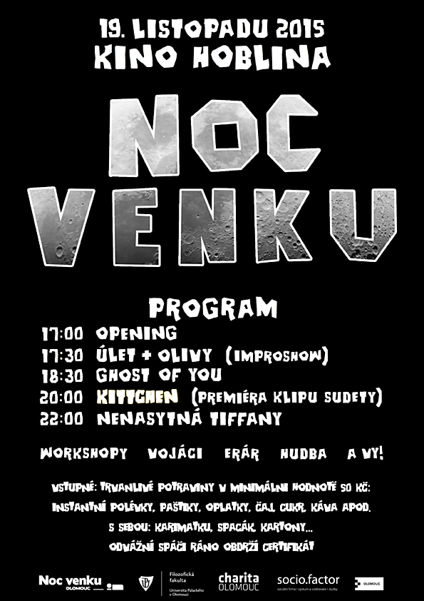 Noc venku se uskuteční ve čtvrtek 19. listopadu v areálu olomouckého letního kina. Program zahájí v 17:30 hodin vystoupení, které je věnováno společné improvizaci skupiny O.LI.V.Y. a divadelního spolku Úlet. Právě jeho herci mají s životem na ulici zkušenost. Součástí programu budou i koncerty Ghost of You a Kittchen, promítání filmu Nenasytná Tiffany, výtvarná dílna a přednáška o bezdomovectví. Do akce se zapojí také Armáda ČR, vojáci budou v polní kuchyni vařit gulášovou polévku a horký čaj. „Vstupným na akci budou opět potraviny. Je možné přinést instantní polévky, konzervy, cukr, čaj a jiné podobné produkty v hodnotě 50 korun, které symbolicky vložíme do popelnic. Ty nám půjčí Technické služby města Olomouc,“ doplnila Eva Klimentová. Vybrané potraviny využijí lidé v terénních programech a v nízkorozpočtovém denním centru, které provozuje Charita Olomouc v rámci střediska Samaritán pro lidi bez domova.
