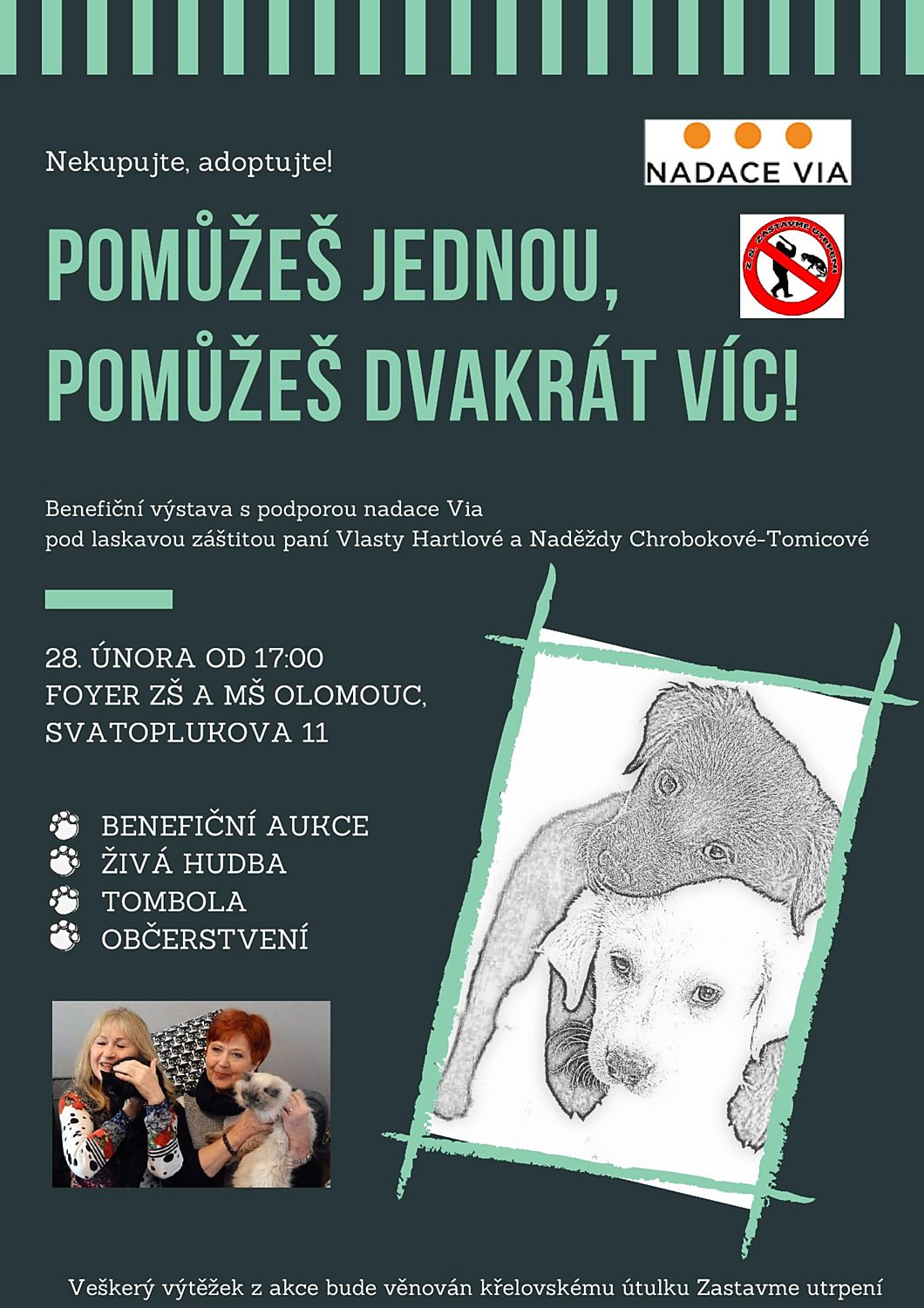 Výtěžek z prodeje obrazů, výtvarných děl, plyšových hraček a kreativních nápadů, které vytvořili nejen sami žáci, ale rovněž učitelé, rodiče či děti navštěvující mateřskou školu, bude věnován spolku Zastavme utrpení, které se věnuje týraným psům a kočkám. Nad benefiční výstavou přijaly patronát herečky Moravského divadla Olomouc paní Vlasta Hartlová a Naděžda Chroboková-Tomicová, které oslovili žáci přímo v divadle.