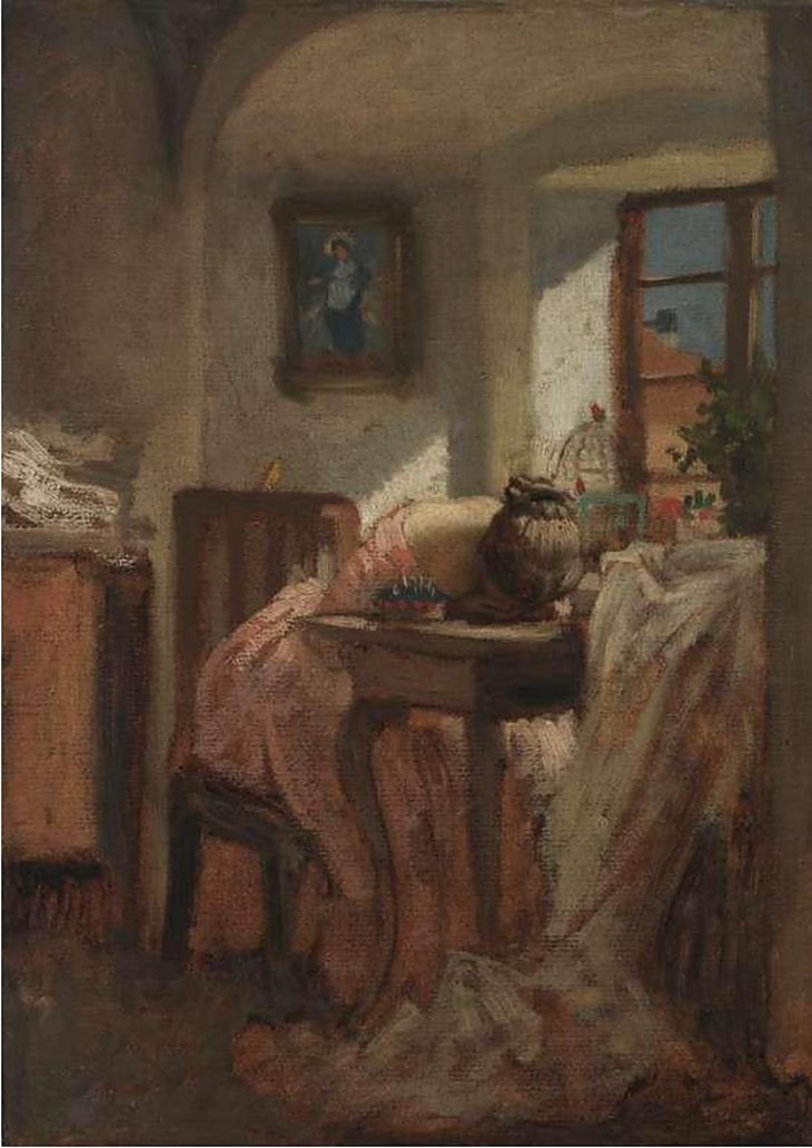 Mnoho odborníků se přelo o to, kdo je na obraze zachycen. Nejrozšířenější verzí bylo, že se jedná o Františku Pokornou, snoubenku Mánesova přítele Adolfa Kosárka, při šití svatebních šatů v okamžiku, kdy se dověděla o smrtelné chorobě svého budoucího muže. Ten již v době jejich zásnub trpěl tuberkulózou, přesto se v září 1858 vzali. Nedlouho po svatbě se dvojici narodila dcera, Kosárek však rok na to zemřel. Obraz plačící dívky je doplněn množstvím atributů umožňujících hlubší interpretaci.