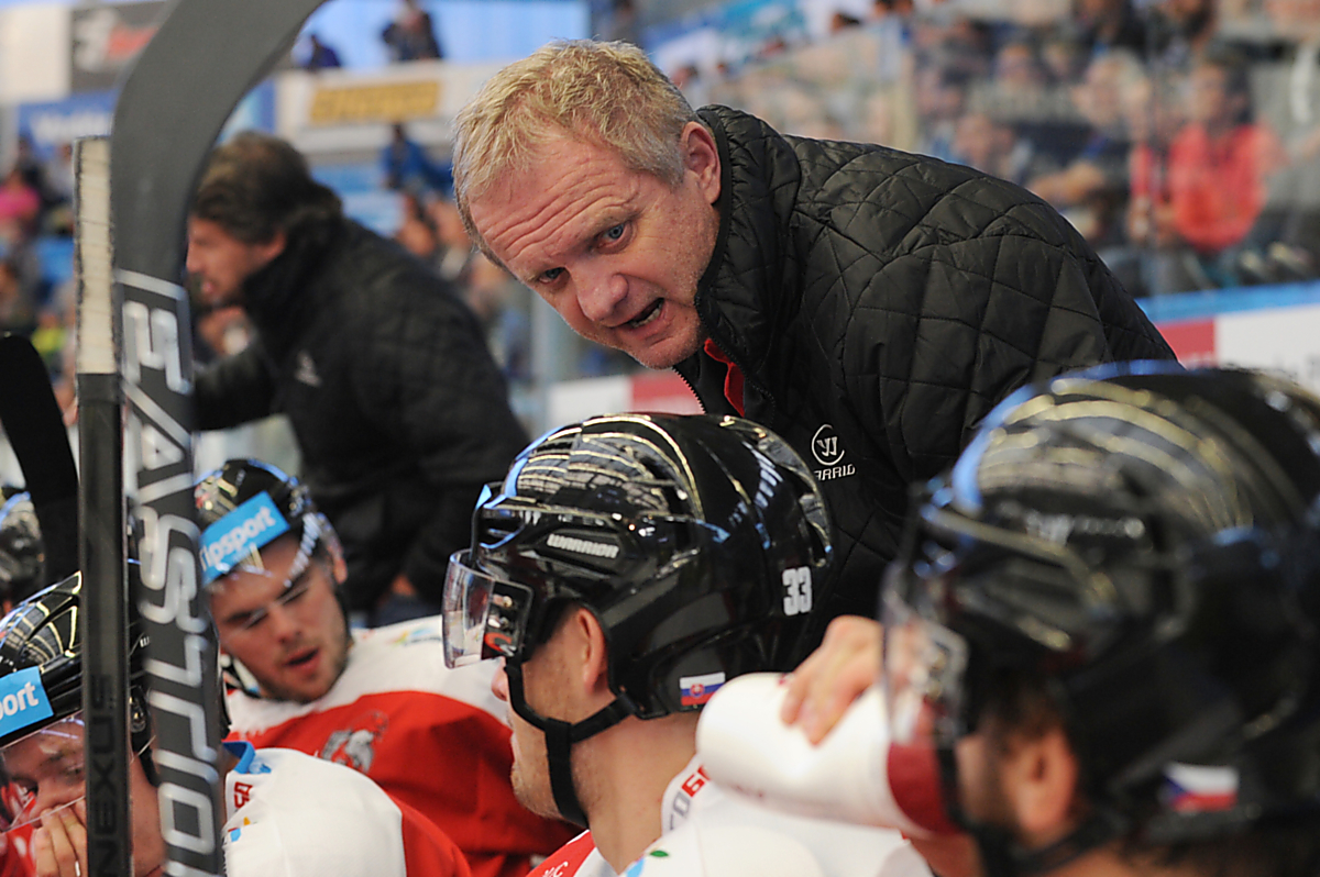 Zdeněk Venera na střídačce HC Olomouc během utkání v Plzni. S ní nakonec Mora o pár bodů prohrála dostihy o play-off.