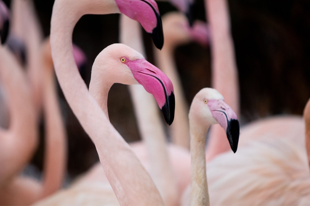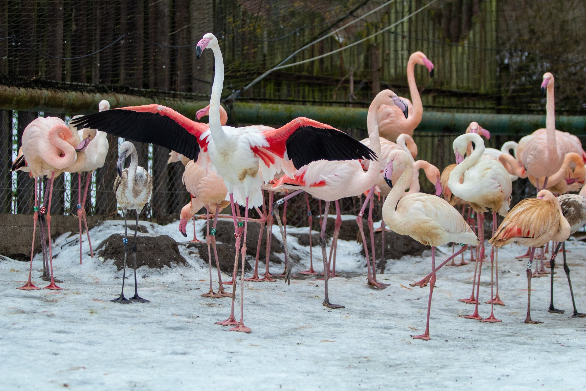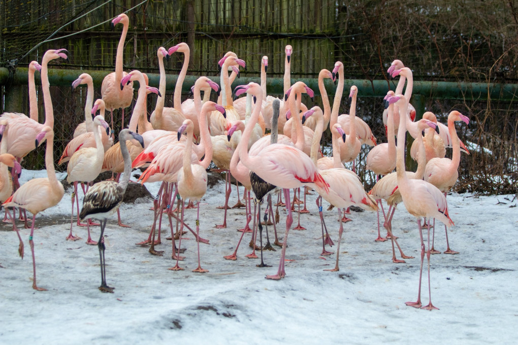 Plameňáci na sněhu. Kdyby se v zoo pořádala soutěž krásy, tihle růžoví elegáni by určitě obsadili čelní místo.