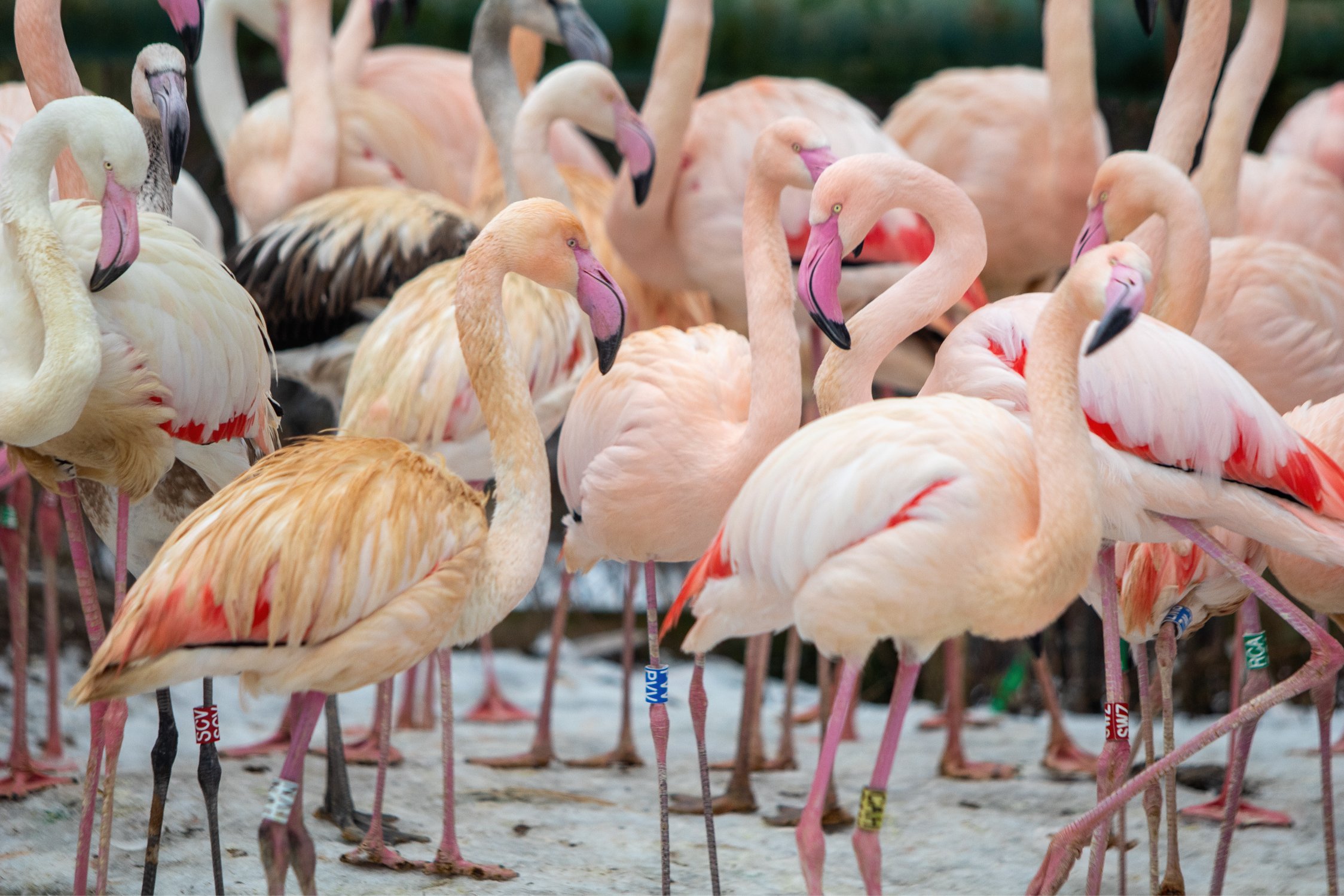 Mláďata, kterých je ve skupině požehnaně, mají šedivé zabarvení. Typickou růžovou barvu získají až zhruba ve dvou letech.