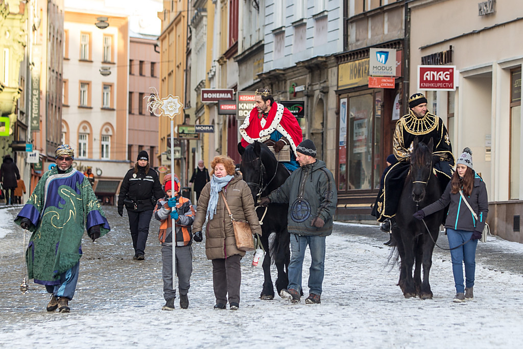Složit poklonu narozenému králi v jeslích se vydali v pátek 6. ledna Tři králové z Charity Olomouc. Dopoledne navštívili s tříkrálovými kasičkami krajské a městské instituce, poté zamířili na koních před radnici k živému betlému.