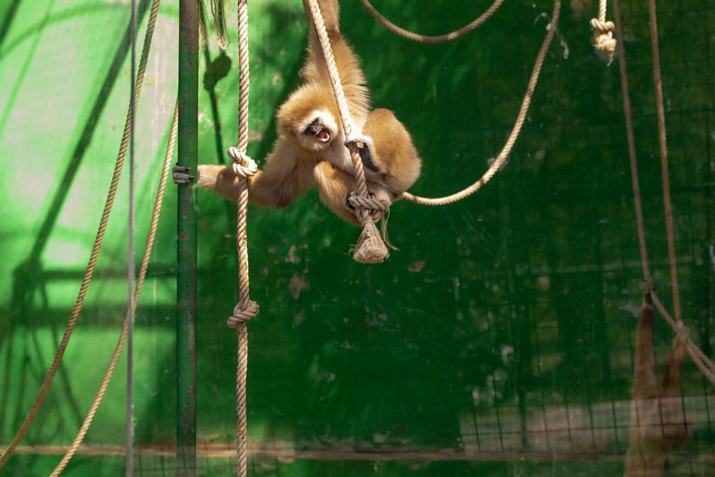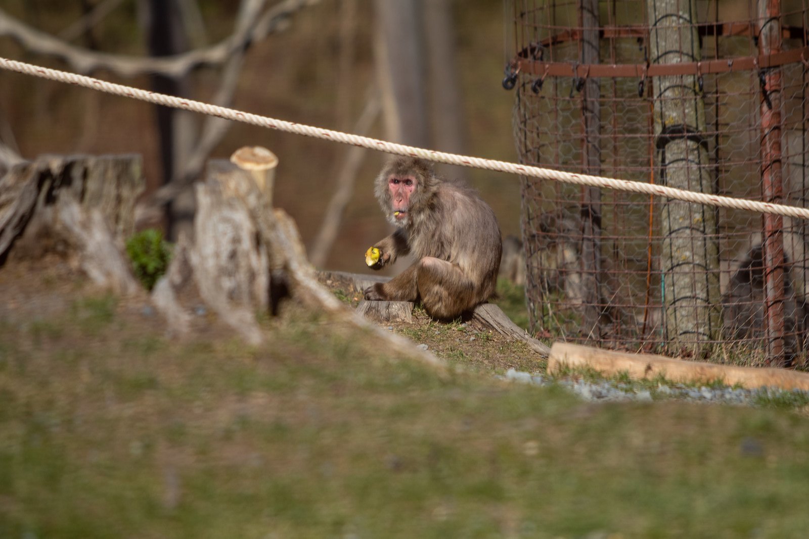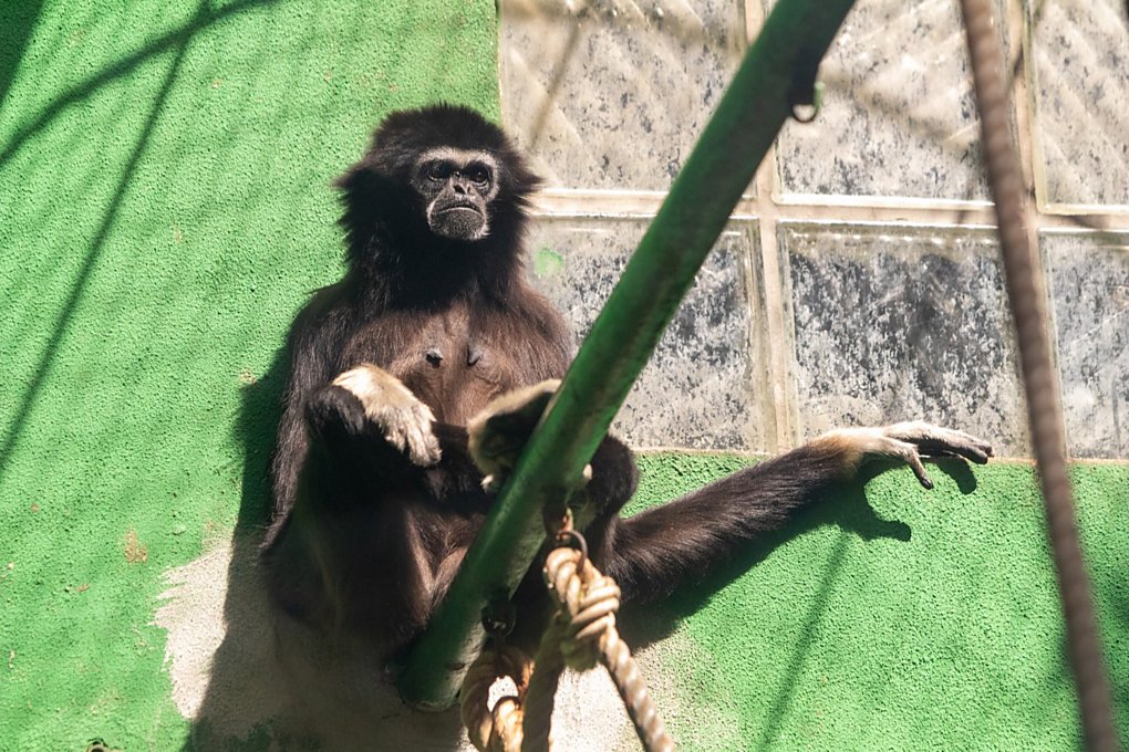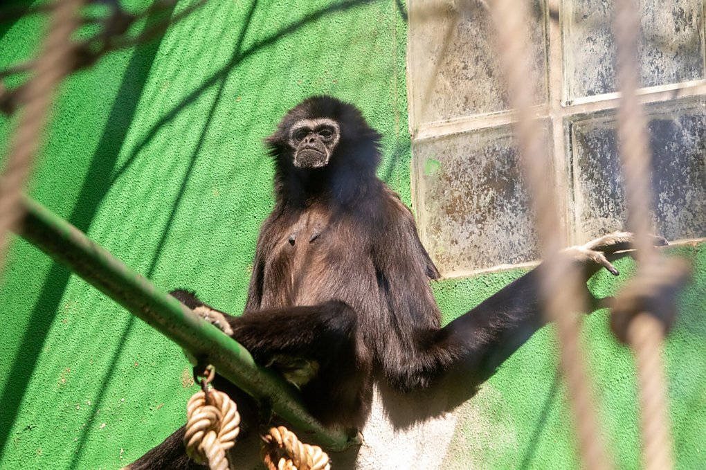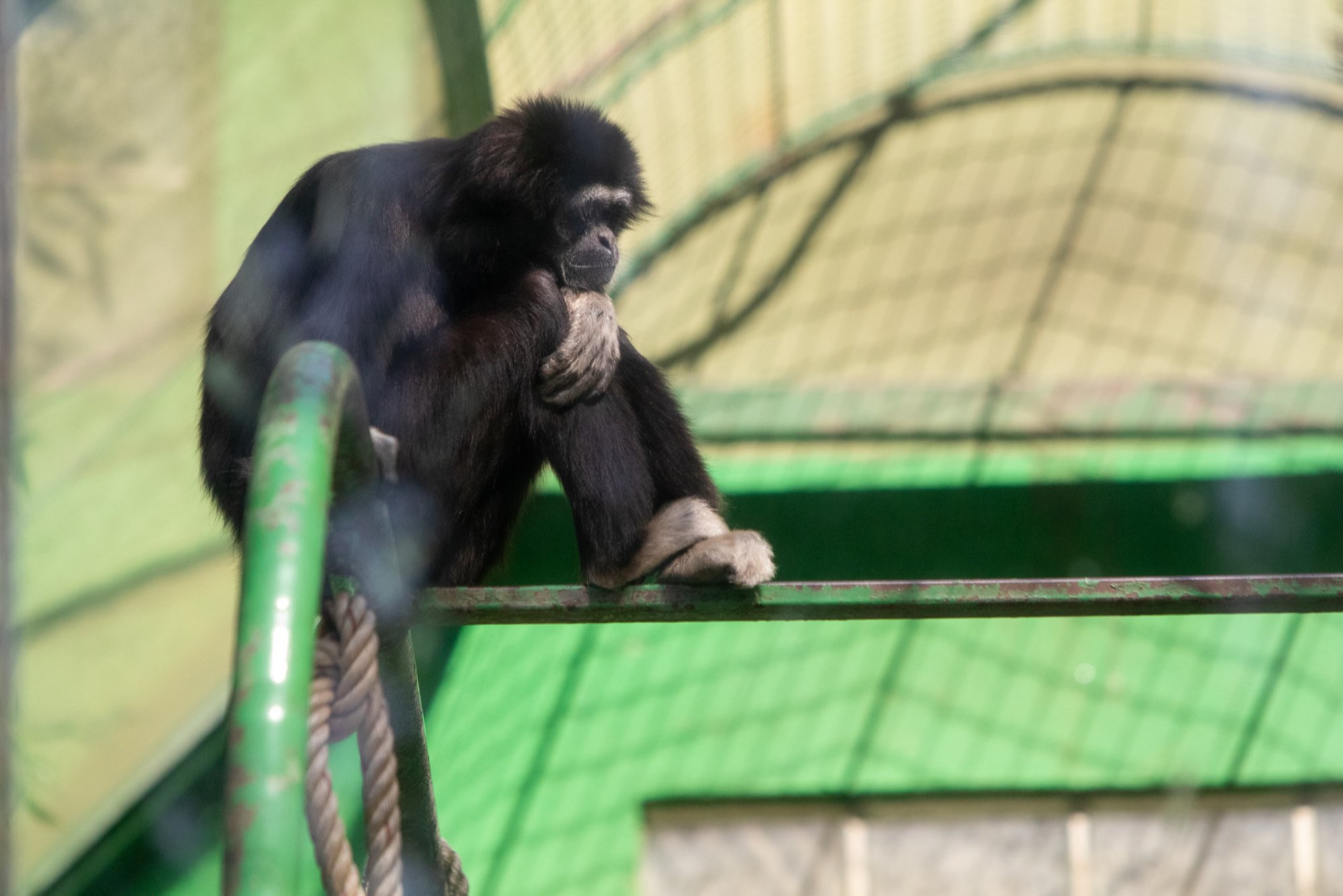 Tenhle opičí pantáta (i když to nejspíš bude samice) působil trochu smutně, ale jeho druhům, skotačícím po výběhu, se zřejmě po lidech nestýská.