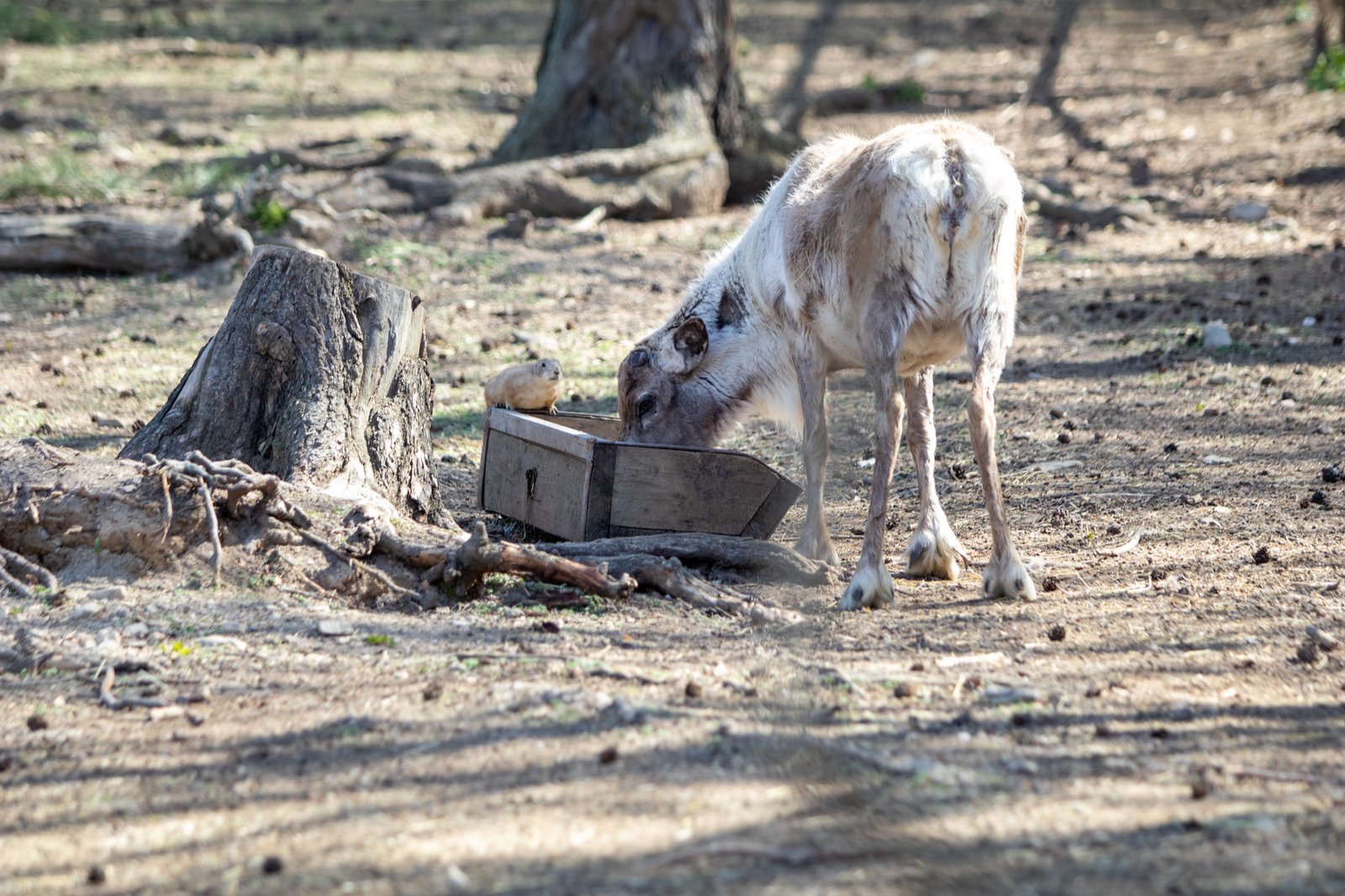 Podle Libuše Veselé je většině zvířat celkem jedno, zda jsou v zahradě návštěvníci, nebo je v ní pusto. "Není pravdou, že by návštěvníci zvířata rušili. Na druhou stranu zvířata ani nevyžadují žádnou pozornost. Řekla bych, že většině z nich je prostě přítomnost lidí úplně jedno," usmívá se Veselá. Je ale faktem, že v zoo je bez návštěvníků prakticky absolutní klid, a když se ho snažíte nerušit, naskytnou se vám jindy nemožné pohledy. Třeba na tuhle veverku (?), nerušeně se krmící v těsném sousedství (pustého) občerstvení u pavilonu Kalahari.