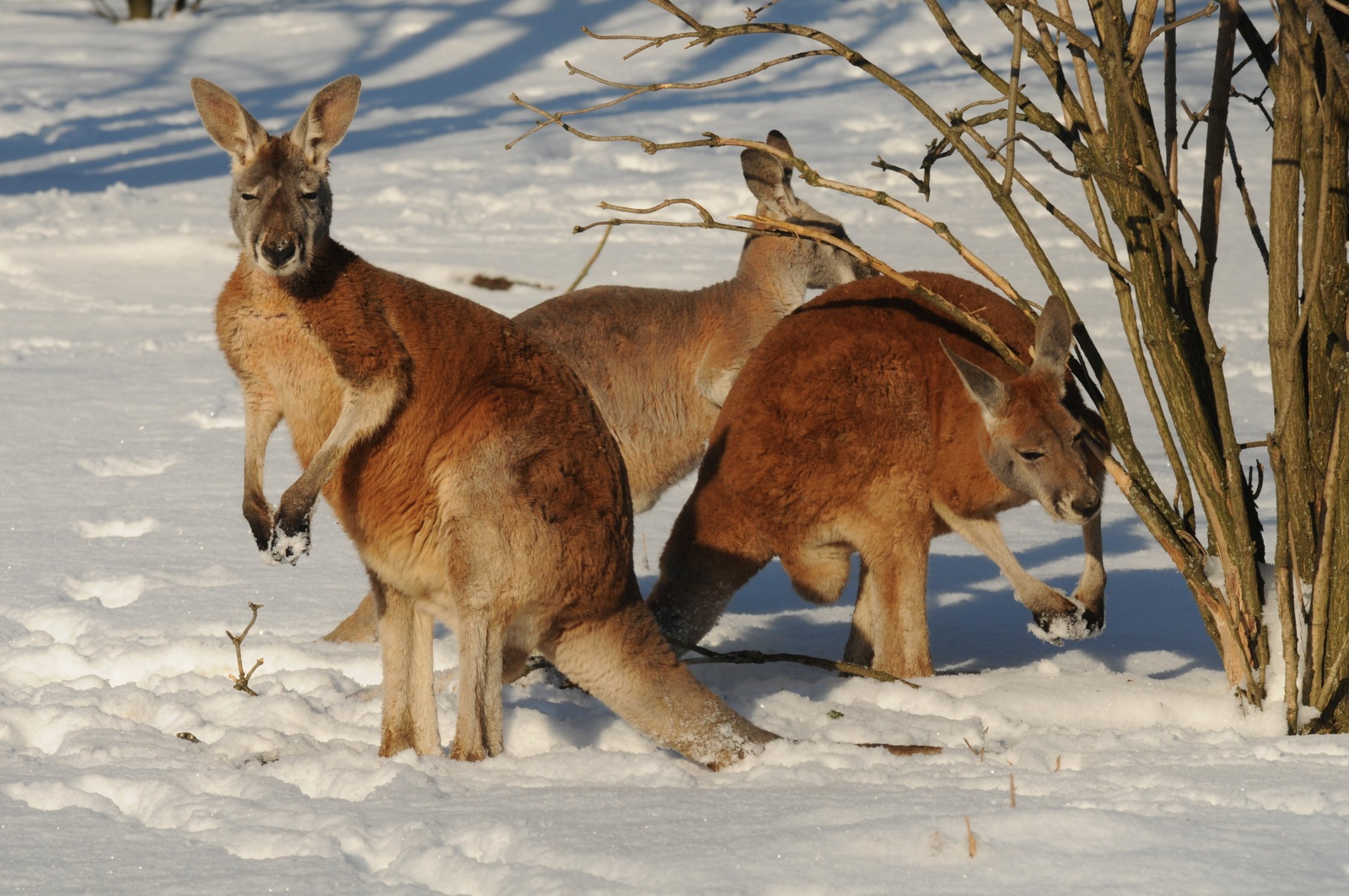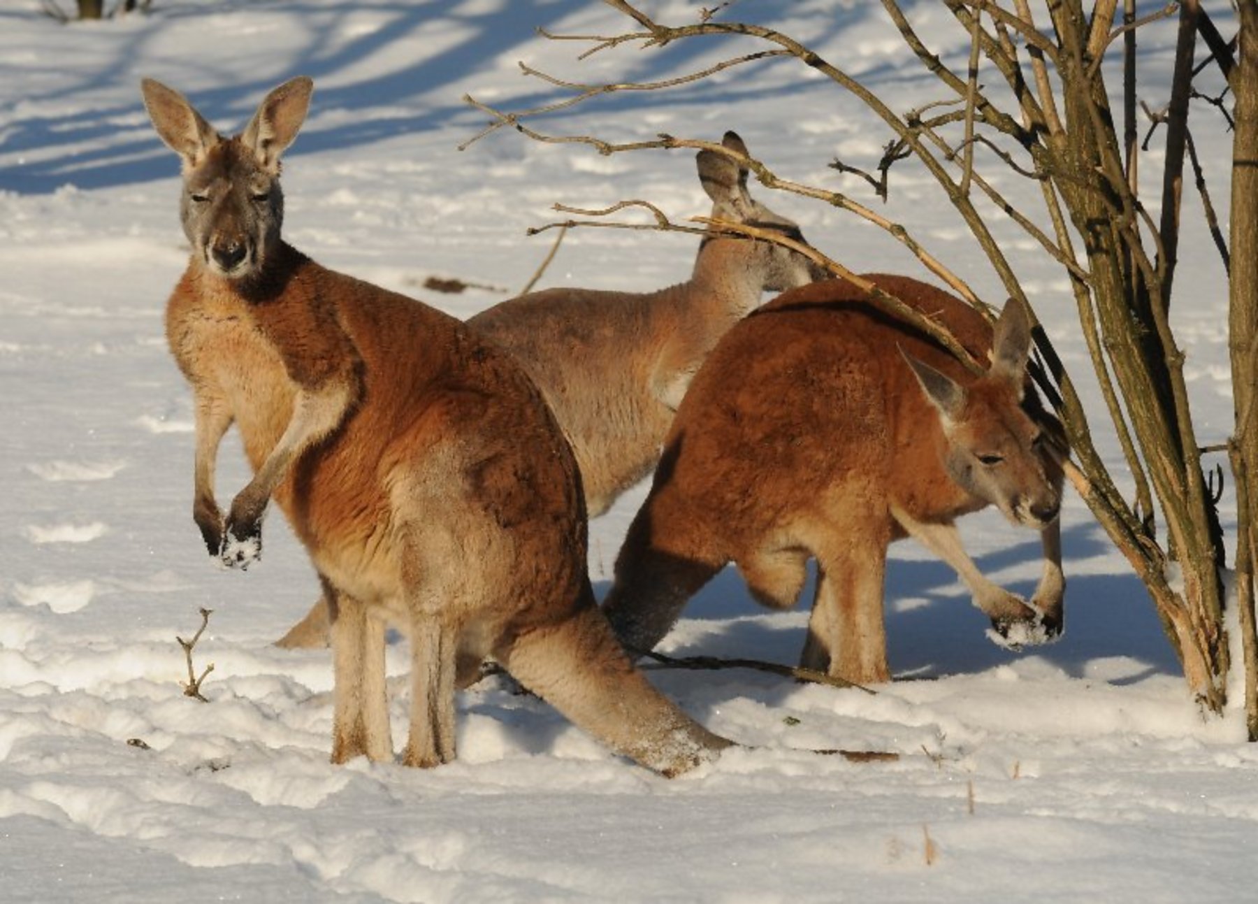 Zvířata, která v olomoucké zahradě chovají, jsou za léta strávená v ní mnohdy teplotně adaptovaná. A tak je možné vidět třeba i klokany, jejichž přirozená domovina v Austrálii během roku jistě skýtá zcela jiné teploty, než panují zde v zimních měsících, jak dovádí na sněhu. Klokani mají navíc k dispozici své 1+1 s vyhřívanou podlahou.
